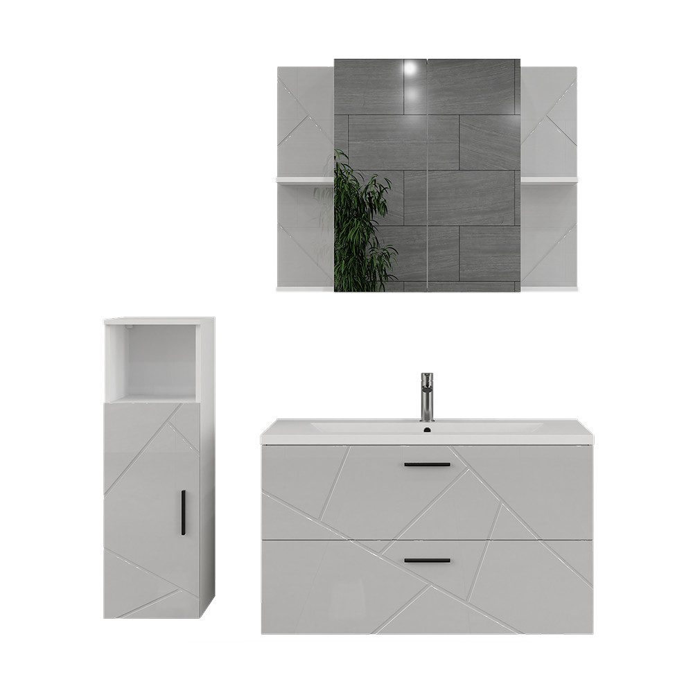 LIEFERUMFANG: Waschbecken, Waschtischunterschrank, Spiegelschrank, Midischrank, Montageanleitung, Montagematerial (Dekoration nicht enthalten).#28497
