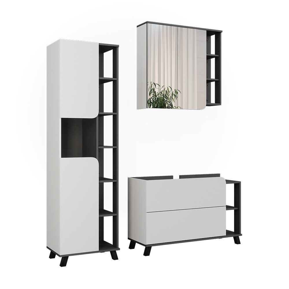 LIEFERUMFANG: Waschbeckenunterschrank, Badspiegelschrank, Hochschrank, Montageanleitung, Montagematerial (Dekoration nicht enthalten).#27699