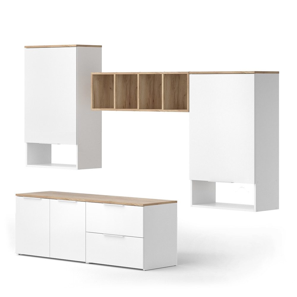 Die Wido - Wohnwand ist das perfekte Möbelstück für alle, die Wert auf modernes Design und reichlich Stauraum legen. Das Set besteht aus 2 Hängeschränken, 2 Kommodenschränken sowie einem Wandregal und kann individuell kombiniert werden. Nutzen Sie die offenen und geschlossenen Fächer, um Ihre Lieblingsstücke perfekt in Szene zu setzen. Mit zusätzlichen Gegenständen aus der Wido - Kollektion können Sie das Set perfekt ergänzen. Egal ob Sie Serienmarathons auf Ihrem Fernseher schauen oder Ihre Wohnung mit schönen Accessoires dekorieren wollen - die Wido - Wohnwandserie ist der perfekte Begleiter.