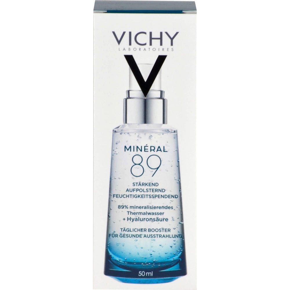 Der Vichy MINÉRAL 89 Hyaluron-Boost mit Sofort-Effekt und 89 % Vulkanischem Wasser aus Vichy und Hyaluron stärkt die Hautschutzbarriere, spendet langanhaltend Feuchtigkeit und wirkt aufpolsternd.