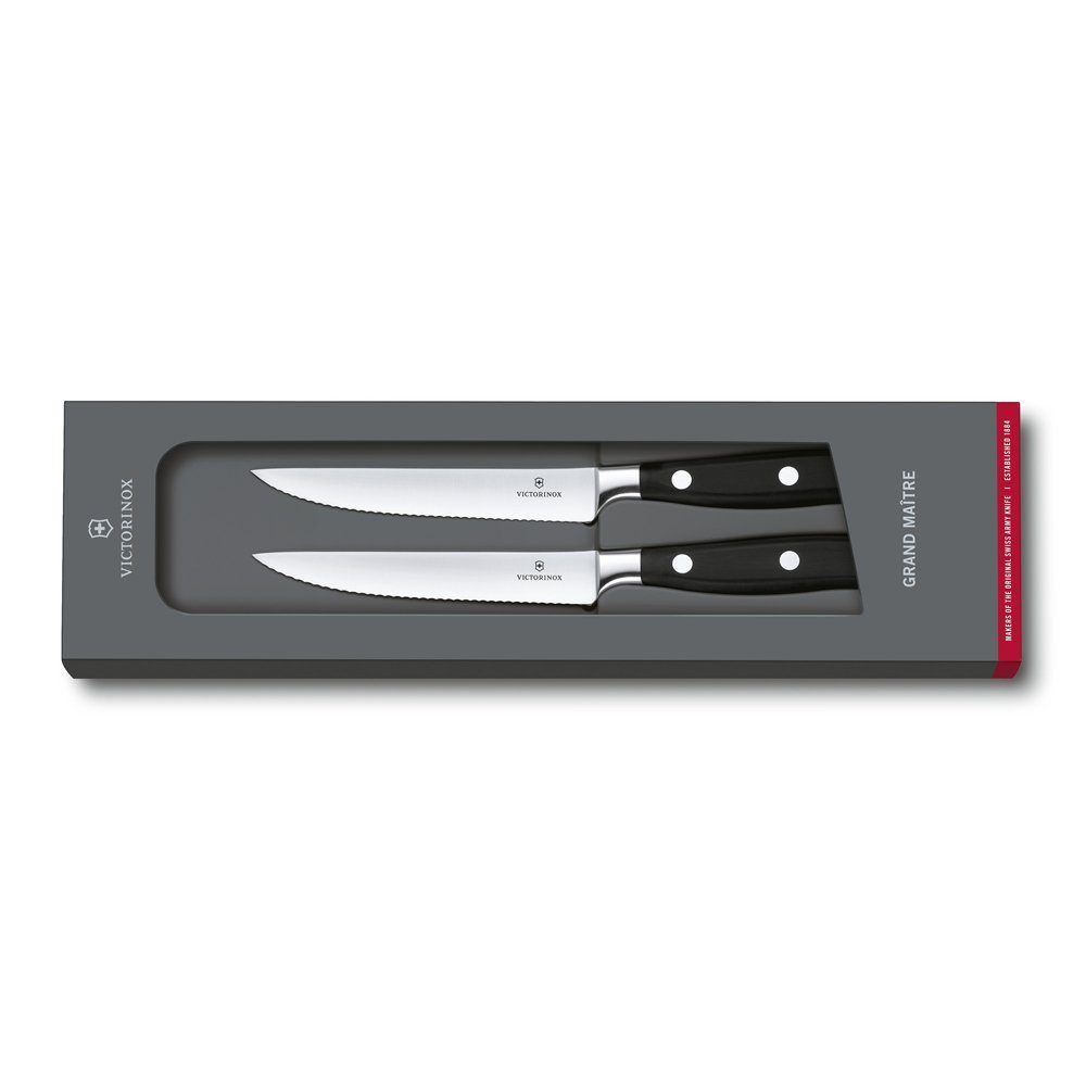 Das beste Fleisch verdient nur die feinsten Werkzeuge. Unser Grand Maître Steakmesser überzeugt mit optimaler Präzision, meisterhafter Verarbeitung und perfekter Balance. Es ist robust, wendig und extra scharf und gleitet mühelos durch Roastbeef, Filet oder Rumpsteak. Im Set sind zwei Messer enthalten. Jetzt heisst es nur noch zurücklehnen und geniessen. Guten Appetit!