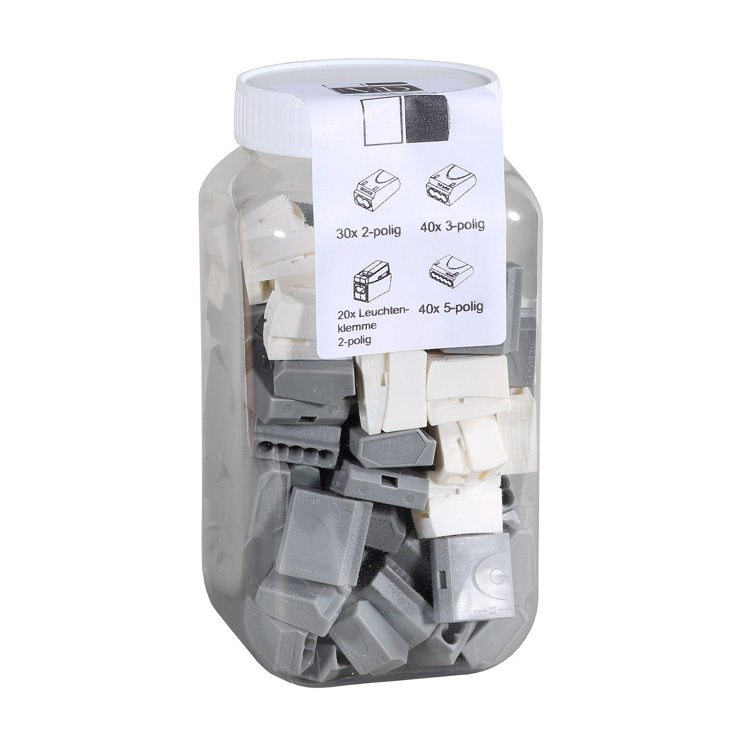 Lieferumfang | 30x 2-polig; 40x 3-polig; 40x 5-polig; 20x Leuchtenklemme 2-polig |