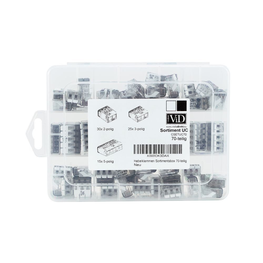 Lieferumfang | 30x Hebelklemme 2-polig 25x Hebelklemme 3-polig 15x hebelklemme 5-polig |