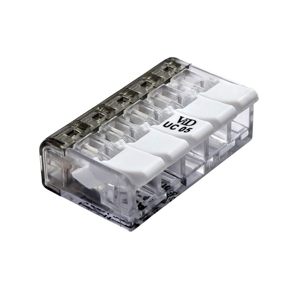 ViD Hebelklemmen sind universell einsetzbar für feindrähtige, eindrähtige und mehrdrähtige Leiter mit einem Durchschnitt von 0,2 bis 4,0mm². Aufgrand der transparenten Bauform und dem praktischen Prüfschlitz kann die korrekte Leiterposition kontrolliert werden.