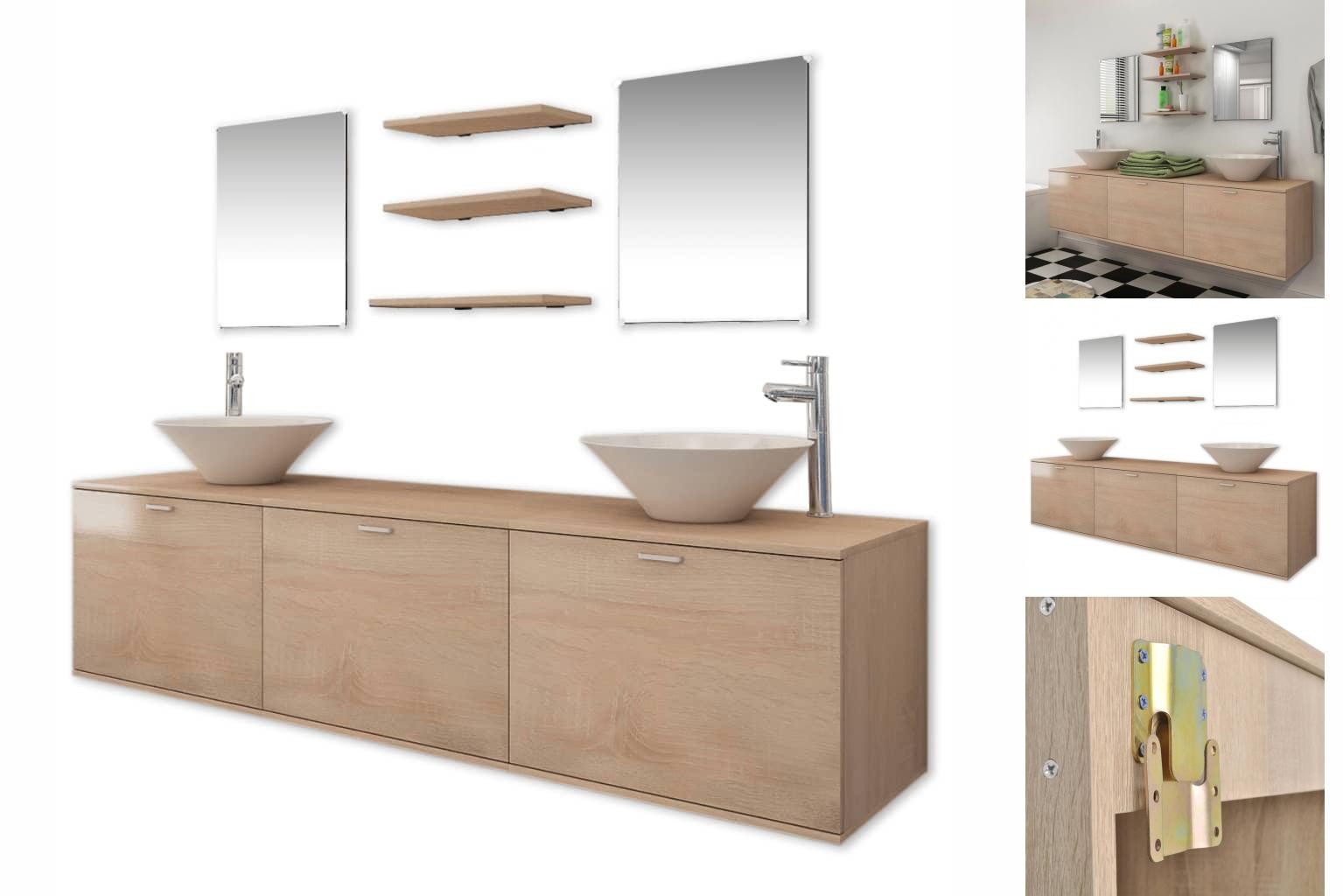 Dieses Komplett-Set, bestehend aus 1 wandmontierbarem Unterschrank, 2 Spiegeln, 3 Regalen, 2 Waschbecken und 2 Wasserhähnen, wird eine ideale Ergänzung für Ihr Badezimmer sein und Ihren Raum optimieren, ohne den Stil zu beeinträchtigen.Der Waschbeckenschrank mit drei herunterklappbaren Türen bieten reichlich Platz, um Ihre Toilettenartikeln, Beauty-Produkte und verschiedene kleinere Gegenstände aufzubewahren. Kämme, Kosmetika, Zahnbürsten und Zahnpasta können griffbereit auf den Regalen gestellt werden. Aus hochwertiger Spanplatte gefertigt, ist diese Waschtischeinheit sehr stabil und langlebig.Die zwei Waschbecken bestehen aus hochwertiger Keramik, die kratzfest, korrosionsbeständig und leicht zu reinigen ist. Sie eignen sich zur Montage über der Tischplatte.Die 2 mitgelieferten hochwertigen Mischbatterien werden mit Warm- und Kaltwasserschläuchen sowie Montageteilen geliefert und sind einfach zu installieren. Dank der verchromten Oberfläche haben diese Mischbatterien einen hochreflektierenden, spiegelnden Glanz und die solide Messingkonstruktion, der Zinkgriff und die Keramikartusche machen die Armaturen sehr langlebig. Die Montage ist wirklich einfach. Bitte beachten Sie, dass die Löcher für die Armaturen nicht vorgebohrt werden.
