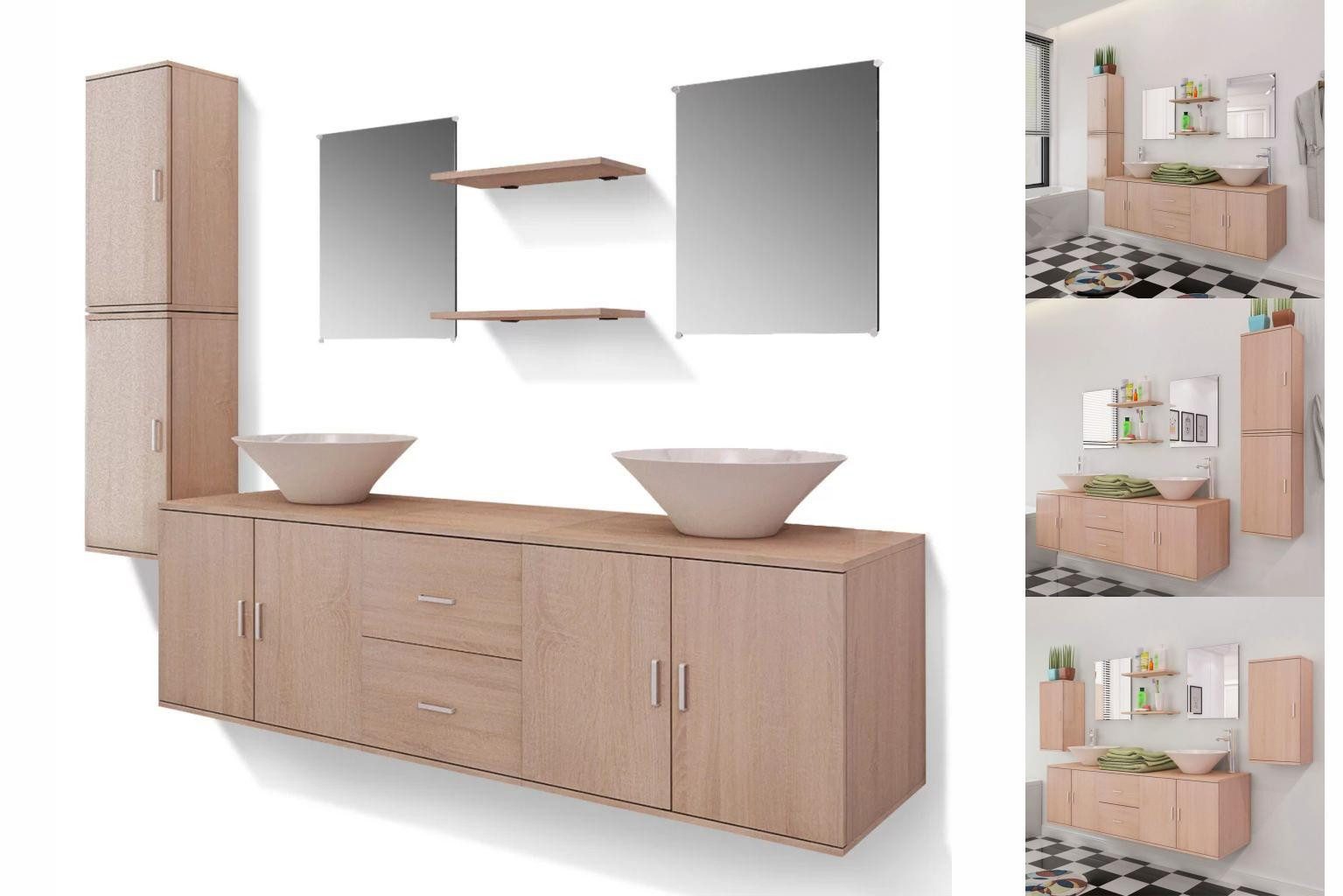 Dieses komplette Set, bestehend aus 1 Wand-Waschbeckenschrank, 2 Wandschränke, 2 Spiegel, 2 Regale und 2 Waschbecken, wird eine große Ergänzung zu Ihrem Badezimmer, die Optimierung Ihres Raumes ohne Kompromisse bei Stil. Die Wandschränke und der Beckenschrank mit zwei Schubladen bieten reichlichen Platz für das speichern von Ihren Toilettenartikel, Beauty-Produkte und verschiedene Arten von kleineren Gegenständen an. Kämme, Kosmetika, Zahnbürsten und Zahnpasta können in den Regalen bequem in Reichweite organisiert werden. Aus hochwertiger Spanplatte ist diese Waschtisch-Einheit sehr stabil und langlebig. Die beiden Becken sind aus hochwertiger Keramik gefertigt, damit sie kratzfest, korrosionsbeständig und leicht zu reinigen sind. Sie eignen sich für die Montage über der Arbeitsplatte. Montage ist wirklich einfach. Die Lieferung beinhaltet auch zwei Pop-up-Ablassschrauben und Montagezubehör.