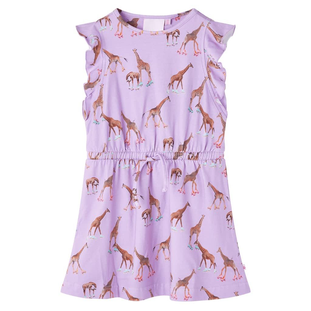 Dieses Kinderkleid hat einen Rundhalsausschnitt, Rüschenärmel und ein elastisches Taillenband. Das Kleid ist mit Giraffen auf Rollschuhen bedruckt. Das kurze Kinderkleid ist aus weichem Material gefertigt, das zu 94 % aus Baumwolle und zu 6 % aus Elastan besteht und daher nicht nur komfortabel, sondern auch atmungsaktiv ist.