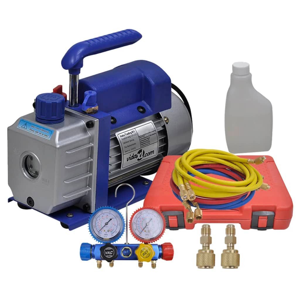 Dieses komplette Kältemittel-Geräteset enthält die Vakuumpumpe und das 4-Wege-Manometer-Set im Formgehäuse. Diese Vakuumpumpe ist für den professionellen Einsatz in Kühl- und Klimaanlagen konzipiert. Die Pumpe erzeugt ein Vakuum, das das anschließende Befüllen der Klimaanlage mit Kältemittel ermöglicht. Aufgrund ihrer technischen Eigenschaften eignet sich die Pumpe für Reparaturen von Kälteanlagen, Druckereimaschinen, medizinischen Geräten, Vakuumverpackungsgeräten, Warmumformungen und für andere Extraktionsvorgänge. Die Pumpe verfügt über ein Aluminiumgehäuse und ein praktisches Ölschauglas, durch das Sie den Ölstand jederzeit überprüfen können. Es hat außerdem einen integrierten Griff für den einfachen Transport. Dieses 4-Wege-Manometer-Set eignet sich zum Befüllen und Prüfen von Klimaanlagen durch Bereitstellung von Systemdruckwerten. Es ist für alle Klimaanlagen sowie für gewerbliche und private Kälteanlagen geeignet. Die farbcodierten Anzeigen sind schnell, klar und leicht abzulesen. Die Anzeigen sind in einem Stoßschutze versehen, um Beschädigungen zu vermeiden. Mit dem integrierten Stahlhaken können Sie die Messgeräte schnell und einfach aufhängen. Das Manometer-Set hat eine langlebige Konstruktion und wird zum einfachen Transport und zur Lagerung in einer blasgeformten Tragetasche geliefert.