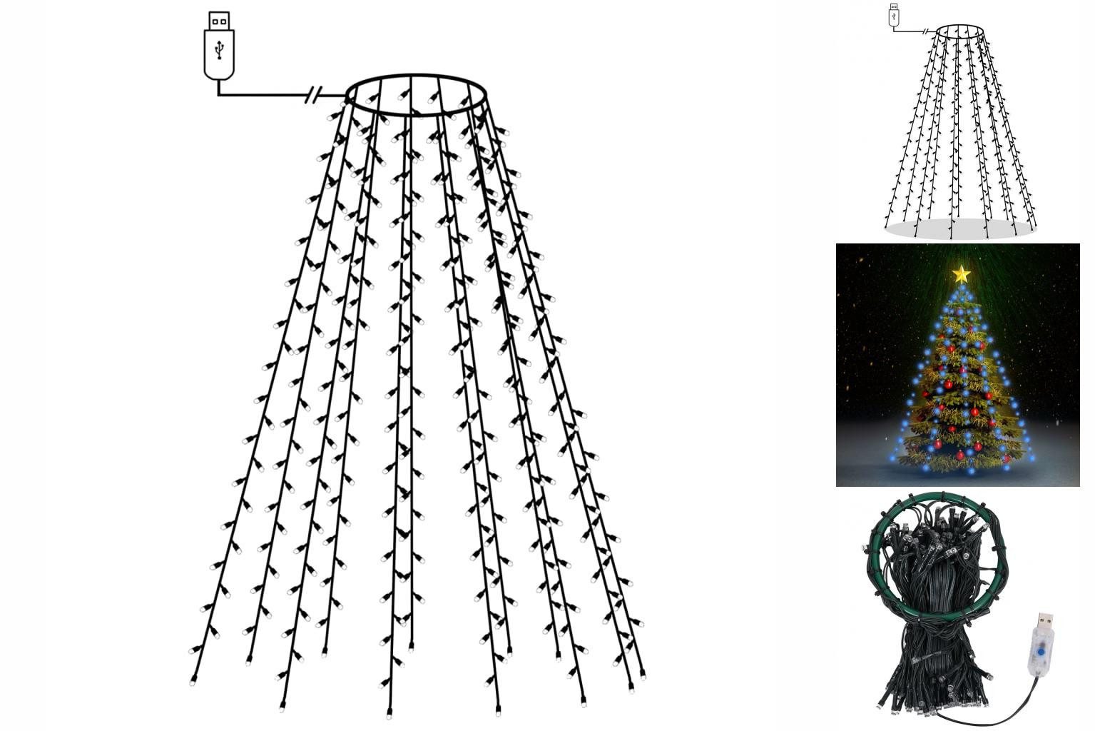 Diese LED-Beleuchtung ist speziell für die Dekoration des Weihnachtsbaums gedacht und schafft eine schöne Atmosphäre. Die 150 Hochleistungs-LEDs sind sehr energieeffizient sind und strahlen ein helles Licht aus. Mit 8 verschiedenen Lichteffekten ? eine Kombination aus allen Effekten, langsam glühend, blinkend, wellenartig, fließend, sequentiell, stetig an und langsam verblassend ? leuchtet die Lichterkette wunderschön und schafft eine magische Weihnachtsstimmung. Diese schöne Weihnachtsdekoration ist wasserabweisend und daher sowohl für den Innen- als auch für den Außenbereich geeignet. Du kannst diese Weihnachtsdeko ganz einfach oben auf den Weihnachtsbaum legen und die Lichterketten fallen auf natürliche Weise zu Boden. Vor allem am Abend ist die Weihnachtsbaumbeleuchtung ein echter Blickfang und dient gleichzeitig als gemütliche Lichtquelle. Bei Nichtgebrauch können diese LED-Leuchten einfach bis zum nächsten Weihnachtsfest aufbewahrt werden. Mit dieser LED-Beleuchtung für den Weihnachtsbaum ist der Spaß vorprogrammiert! Bitte beachte, dass der Weihnachtsbaum und die Kugeln nicht im Lieferumfang enthalten sind. Das mitgelieferte USB-Netzteil ist nicht wasserdicht, daher muss dieses Teil das Wasser meiden. Dank des 5 m langen Kabels kann der Artikel jedoch im Freien verwendet werden, da das Kabel und das Produkt wasserfest sind. Hinweis: Das Produkt verfügt über einen USB-Anschluss, aber die zertifizierte 5-V-USB-Stromquelle ist nicht im Lieferumfang enthalten.