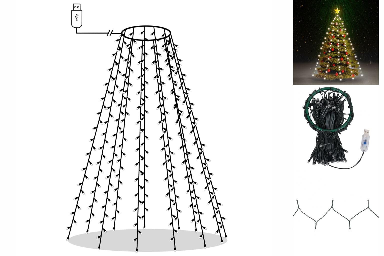 Diese LED-Lichterketten wurden speziell für das Dekorieren Ihres Weihnachtsbaums entwickelt und schaffen eine angenehme Atmosphäre. Die 210 Hochleistungs-LEDs sind sehr energieeffizient sind und strahlen ein helles Licht aus. Mit 8 verschiedenen Lichteffekten: eine Kombination aus allen Effekten, langsames Glühen, Blinken, wellenartig, laufendes Wasser, sequentiell, stetig an und langsam verblassend, leuchtet es wunderschön und schafft eine magische Weihnachtsstimmung. Diese schöne Weihnachtsdekoration ist wasserabweisend und daher sowohl für den Innen- als auch für den Außenbereich geeignet. Sie können diese Weihnachtsdeko ganz einfach oben auf Ihren Weihnachtsbaum legen und die Lichterketten fallen auf natürliche Weise gen Boden. Vor allem am Abend ist sie ein echter Blickfang und dient gleichzeitig als gemütliche Lichtquelle für die Umgebung. Bei Nichtgebrauch können diese LED-Leuchten einfach bis zu den nächsten Feiertagen aufbewahrt werden. Zu Weihnachten wird Ihnen der LED-Weihnachtsbaum viel Freude bereiten! Bitte beachten Sie, dass der Weihnachtsbaum und die Kugeln nicht im Lieferumfang enthalten sind. Der mitgelieferte USB ist nicht wasserdicht, daher muss diese Komponente das Wasser meiden, aber dank des 5 m langen Kabels kann der Artikel im Freien verwendet werden, da Kabel und Produkt wasserfest sind.