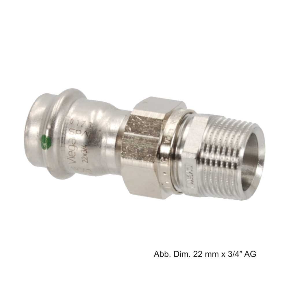 Viega Sanpress Inox Verschraubung, flachd. mit AG, Modell 2365, 15mm x 3/4" - Eigenschaften: Sanpress Inox ist ein sicheres, wirtschaftliches Trinkwasserinstallationssystem mit moderner Pressverbindungstechnik, bestehend aus Edelstahlrohren und Edelstahl-Pressverbindern mit DVGW-Prüfzeichen. Hierbei handelt es sich um Edelstahlfittings nach DVGW-Arbeitsblatt W 534. für alle Trinkwässer geeignet hygienisch einwandfrei DVGW-zertifiziert und güteüberwacht hoher Schutz vor Korrosion vielfältige Anwendungsbereiche beim Pressen besteht keine Brandgefahr einmalige Pressverbindervielfalt für rationelle Installationen Qualität für ein Hausleben lang attraktives Preis-Leistungs-Verhältnis Einsatzbereich: Einsatz für alle Trinkwasser- und Heizungsinstallationsrohre kann mit allen Rotguss-Fittingen und Edelstahl kombiniert werden. Zulassung: Das Sanpress Inox-System ist vom DVGW nach Arbeitsblatt W 534 zugelassen und zertifiziert. Anschluss: mit Viega Pressanschlüssen mit SC-Contur VG438265