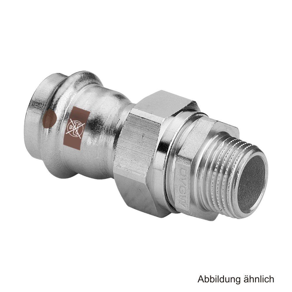 Viega Temponox Übergangsverschraubung mit AG, Modell 1765, 35 mm x 1 1/4" - Eigenschaften: Strömungsoptimiertes Pressverbindersystem aus Edelstahl 1.4301 und Rohren aus Edelstahl 1.4520. Pressverbinder ab d76,1 mit Edelstahlschneidring zur Sicherstellung der mechanischen Belastbarkeit der Verbindung. Die Presskraft liegt vor und hinter dem Dichtelementesitz an. Geeignet für Auf- und Unterputz-Installationen von Steigleitungen und Etagen-Installationen. Normen und Zulassungen: Pressverbindersystem nach DIN EN 10088‑2 und DIN EN 10312. Bei Einsatz in Heizungsanlagen VDI-Richtlinie 2035 und DIN EN 12828 beachten. Betriebsbedingungen mit EPDM-Dichtelement: Das Pressverbindersystem Temponox ist bei nachfolgenden Betriebsparametern einsetzbar: Heizungsanlagen nach DIN EN 12828 Betriebstemperatur max. 105 °C / 221 °F Pressverbinder mit SC‑Contur: Versehentlich nicht verpresste Verbindungen werden beim Befüllen der Anlage sichtbar undicht. Viega gewährleistet das Erkennen unverpresster Verbindungen in den folgenden Druckbereichen: min. Wasserdruck: 0,1 MPa / 100 kPa / 1 bar / 14,5 PSI max. Wasserdruck: 0,65 MPa / 650 kPa / 6,5 bar / 94,3 PSI min. Luftdruck: 22 hPa / 2,2 kPa / 22 mbar / 0,3 PSI max. Luftdruck: 0,3 MPa / 300 kPa / 3 bar / 43,5 PSI Werkstoffe: Verbinder: Edelstahl 1.4301 Rohre: Edelstahl 1.4520 Dichtelemente: EPDM (Ethylen-Propylen-Dien-Kautschuk), schwarz, vormontiert Kennzeichnung: brauner Punkt auf Pressende Symbol »Nicht für Trinkwasser-Installationen zugelassen«, braune Linie auf den Rohren, brauner Aufkleber abziehbar als Verpressindikator ab d76,1 Einsatzbereiche: Geschlossene Kühl- und Heizungsanlagen Druckluftanlagen Solaranlagen mit Flachkollektoren Solaranlagen mit Vakuumkollektoren (nur mit FKM-Dichtelement) Industrieanwendungen NICHT FÜR TRINKWASSER GEEIGNET! VG812119