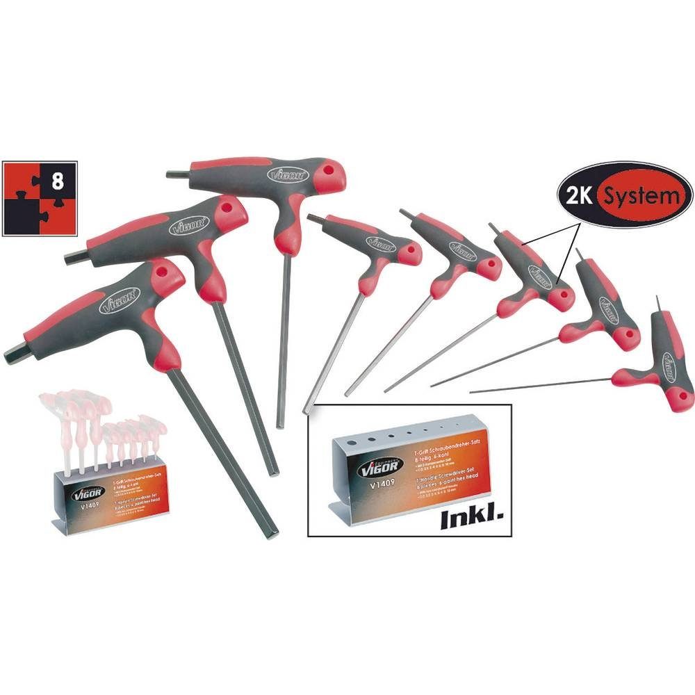 Lieferumfang | T-Griff Schraubendreher SW 2/2,5/3/4/5/6/8/10 mm · Halter. |