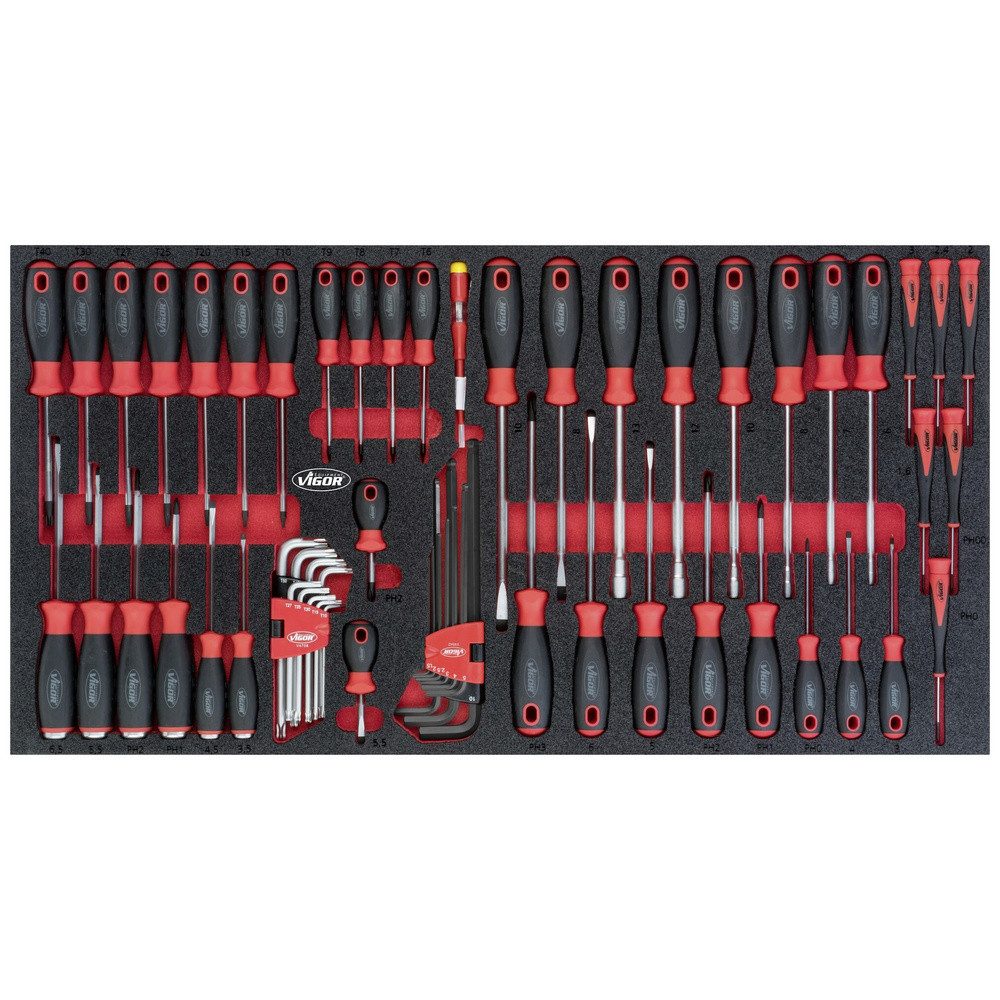 2K Weichschaum-Einlage Einlagenmaß / Schubladengröße: XL (750 x 393 x 35 mm) VIGOR 2-Komponenten-Weichschaum-Einlagen Leicht zu reinigen: unter fließendem Wasser säubern und trocknen Fehlende Werkzeuge fallen sofort durch die rote Mulde auf Всеs liegt an seinem Platz – die perfekte Ordnung Schützt die Werkzeuge, da diese verrutschsicher eingebettet werden Jedes Werkzeug hat seinen vordefinierten Platz Resistent gegen Öle und Fette Abtrieb: Außen-Sechskant Profil, Innen Innensechskantrun Profil, Innen-Sechskant Profil, Kreuzschlitz Profil PH, Pozidriv Profil PZ, Schlitz Profil Schlüsselweite: ∙ 0,5 x 3 – 1,6 x 10 · 7 – 13 · PH0 – PH3 · T6 – T40 Abmessungen / Длина: 750 mm x 393 mm x 35 mm Einlagenmaß / Schubladengröße: XL (750 x 393 mm)