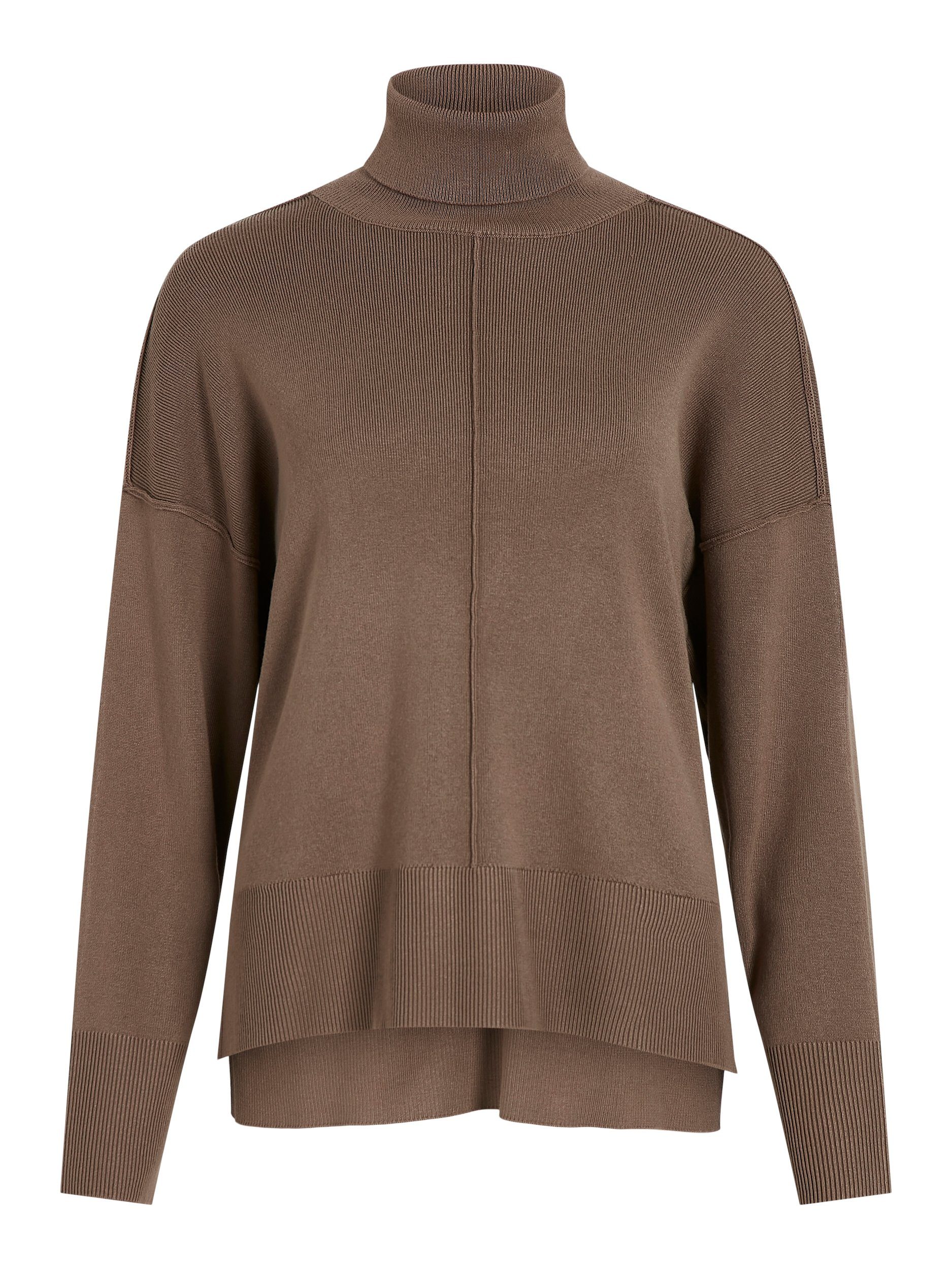 Schau dir den Rollkragenpullover von Vila mal genauer an. Der Rollkragen wird am Hals umgeschlagen und sieht schlauchartig aus. Er wärmt deinen Hals und umrahmt gleichzeitig dein Gesicht. Die langen Ärmel enden in einem Rippstrickbündchen, das für guten Sitz sorgt. Dieser Pullover hat einen Rundhalsausschnitt und ist hüftlang sowie basic geschnitten, wodurch dein Oberkörper locker umspielt wird. Das Oberteil hat einen Vokuhila-Schnitt und ist daher hinten länger geschnitten als vorne.