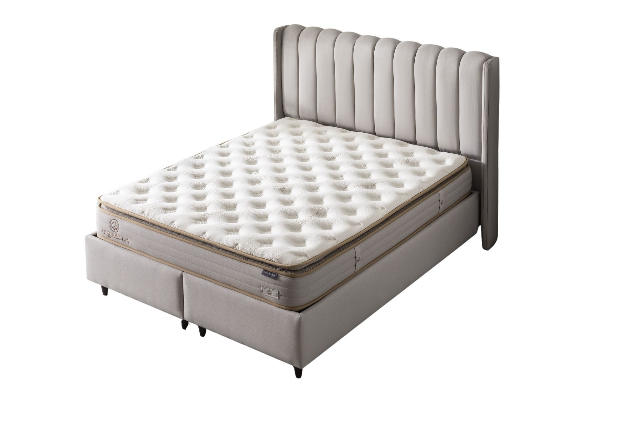 Das Organic Bett Set mit Bettkasten ist die perfekte Wahl für alle, die auf der Suche nach einem stilvollen und zugleich funktionalen Bett für ihr Schlafzimmer sind. Dieses Bettset kombiniert modernes Design mit praktischen Eigenschaften, um Ihnen einen erholsamen Schlaf und eine ordentliche Umgebung zu ermöglichen.Der Bettkasten unter der Liegefläche bietet großzügigen Stauraum für Bettwäsche, Decken, Kissen oder andere persönliche Gegenstände. Dieser Stauraum ist diskret und leicht zugänglich, sodass Sie Ihr Schlafzimmer stets ordentlich und organisiert halten können, ohne auf zusätzlichen Stauraum angewiesen zu sein.Das Bettset ist in verschiedenen Größen erhältlich, von 90x190 cm bis 180x200 cm, was es ideal für unterschiedliche Bedürfnisse und Raumgrößen macht. Das Bett selbst ist in einem eleganten Beige gehalten, das Ihrem Schlafzimmer eine warme und einladende Atmosphäre verleiht.Das moderne Kopfteil ist mit einer vertikalen Steppung versehen, die dem Bett eine zeitgemäße und stilvolle Optik verleiht. Dieses Design-Element fügt sich nahtlos in moderne und klassische Schlafzimmerdekore ein und bietet zugleich eine bequeme Rückenlehne.Ein weiteres Highlight des Organic Bett Sets ist die hochwertige Matratze, die mit einem festen Topper ausgestattet ist. Dieser feste Topper sorgt für zusätzlichen Komfort und unterstützt eine ergonomische Schlafposition, sodass Sie jede Nacht erholsam schlafen können.