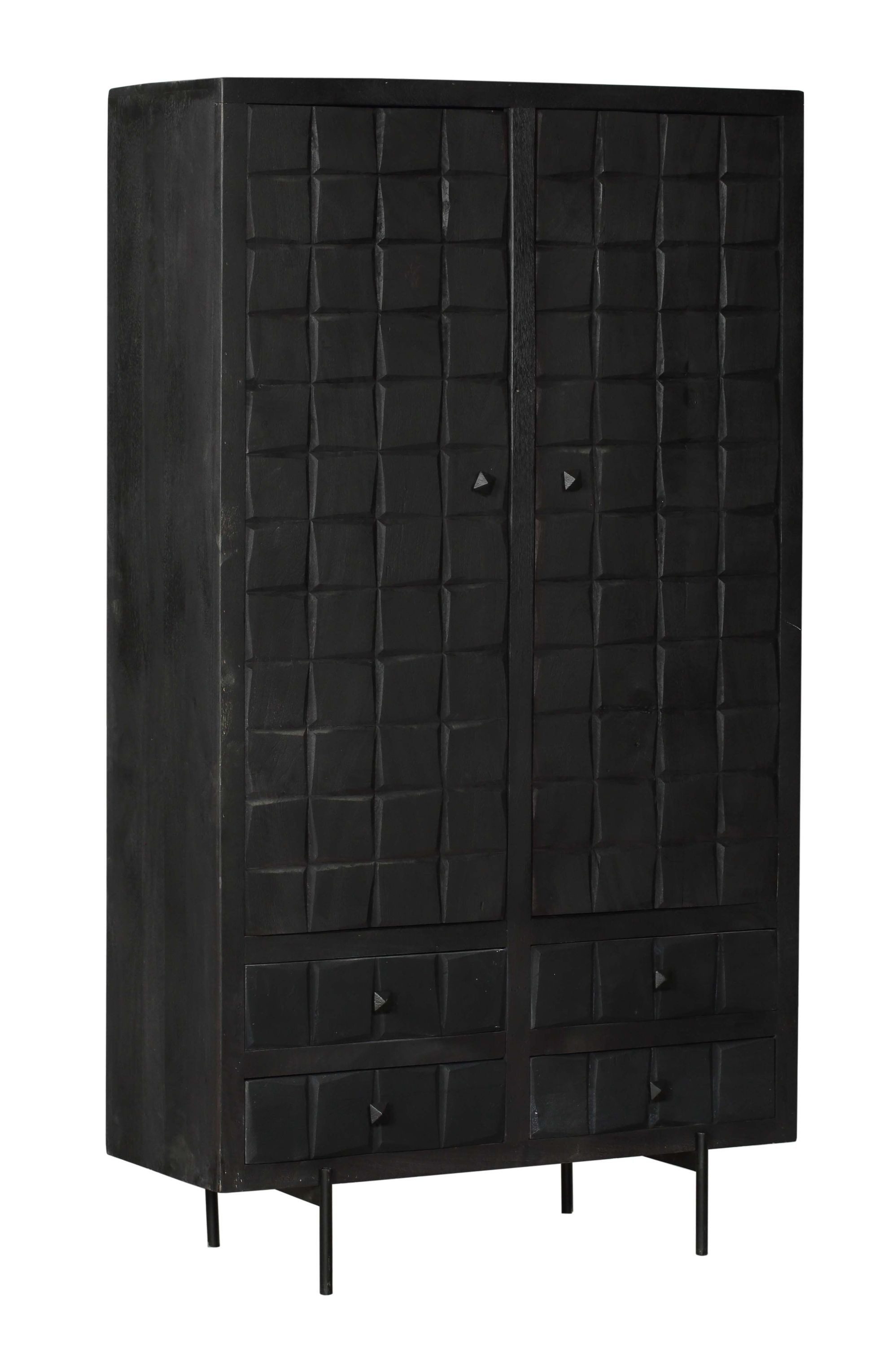 Der Schrank Savion Black besteht aus Mangoholz und verfügt über ein Metallbein. Dieses Modell hat zwei Türen und vier Schubladen. Der Schrank ist mit mehreren schwarz lackierten Holzstreifen eingelegt, wodurch ein eingeschnittenes Blockmuster entsteht, das der Wohnserie Savion Black von Villa Möbel einen einzigartigen Look verleiht. Abmessungen Breite: 100 cm Tiefe: 40 cm Höhe: 180 cm Pflege: mit einem leicht feuchten Tuch abwischen.