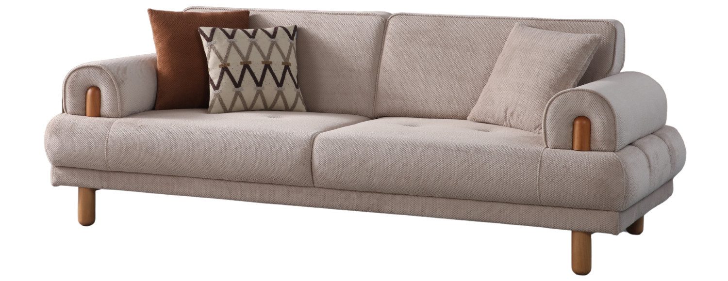 Besonders markant sind die sanft abgerundeten Armlehnen und die sichtbaren Holzfüße, die dem Sofa einen charaktervollen Auftritt verleihen. Die großzügige Sitzfläche mit angenehm fester Polsterung sorgt für langanhaltenden Sitzkomfort. Ob als stilvolles Einzelstück oder in Kombination mit dem passenden 2-Sitzer – Selva bringt wohnliche Eleganz in jeden Raum.