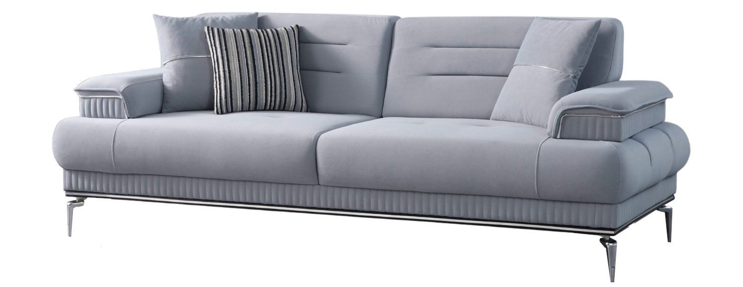 Das Toledo Sofa besticht durch seinen edlen Samtstoff in Anthrazit oder Hellgrau, der dem Möbelstück eine samtige Haptik und elegante Ausstrahlung verleiht. Die schlanken Metallfüße in Chrome unterstreichen den modernen Look und sorgen für einen stabilen Stand.