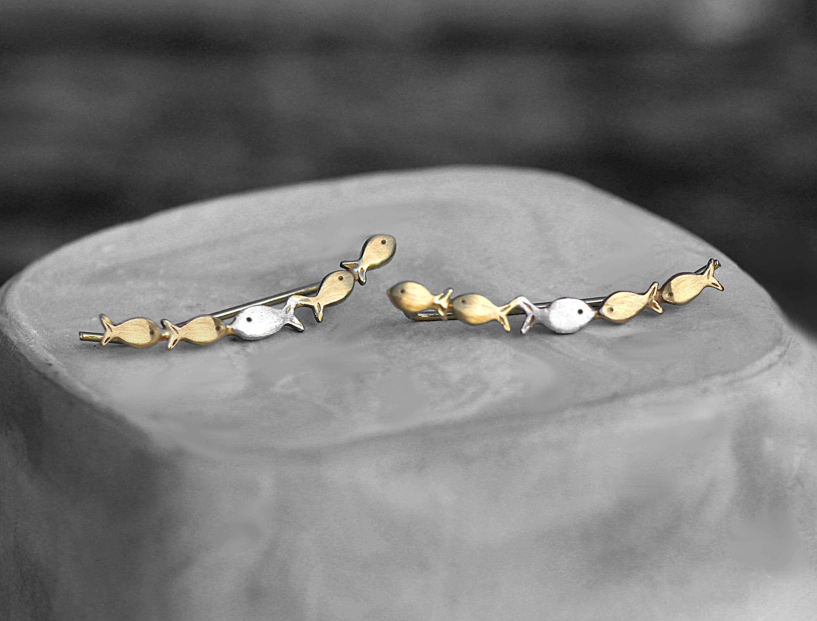 Manchmal, egal was passiert, muss man gegen den Strom schwimmen.... Dies ist die INVERTIERTE Version unserer beliebten Ohrringe: Komplett vergoldet mit einem silbernen Fisch, der GEGEN DEN STROM schwimmt. Die Ohrklemmen sind aus Sterlingsilber (gestempelt) und 750er vergoldet. Ohrklemmen funktionieren wie Haarnadeln: Stecken Sie den Haken wie üblich durch Ihr Ohrloch. Ziehen Sie dann den Haken auf der Rückseite Ihres Ohres fest, indem Sie ihn zusammendrücken. Das war's :-). Um die komplette GEGEN DEN STROM Kollektion (Ringe, Ohrringe, Ketten, Armbänder) zu sehen, tippen sie einfach STROM in das Suchfeld unseres Shops. Eingetragenes Design. Unser exklusiv designter Schmuck, endgefertigt in unserer kleinen Werkstatt in Berlin, kommt immer in plastikloser Logo-Verpackung. Sie unterstützen mit Ihrem Kauf ein unabhängiges Familienunternehmen. Mit der Verwendung von recycletem Silber, plastikfreier Verpackung sowie CO²-Kompensation schonen wir Umwelt und Klima. Zur eindeutigen Identifikation unseres Produkts dient die jeweils angegebene SKU-Artikelnummer sowie der Name und die Beschreibung des Schmuckstücks in diesem Angebot. Hersteller und Verkäufer des Schmuckstücks ist die Villa Sorgenfrei Schmuckmanufaktur Gmbh, Adresse und Kontaktinfo: Freienwalder Str. 17, 13055 Berlin, Tel. 030 3512 8209, Email villa@villamail.de; Verantwortlicher: Geschäftsführender Gesellschafter Dirk Dotzert.