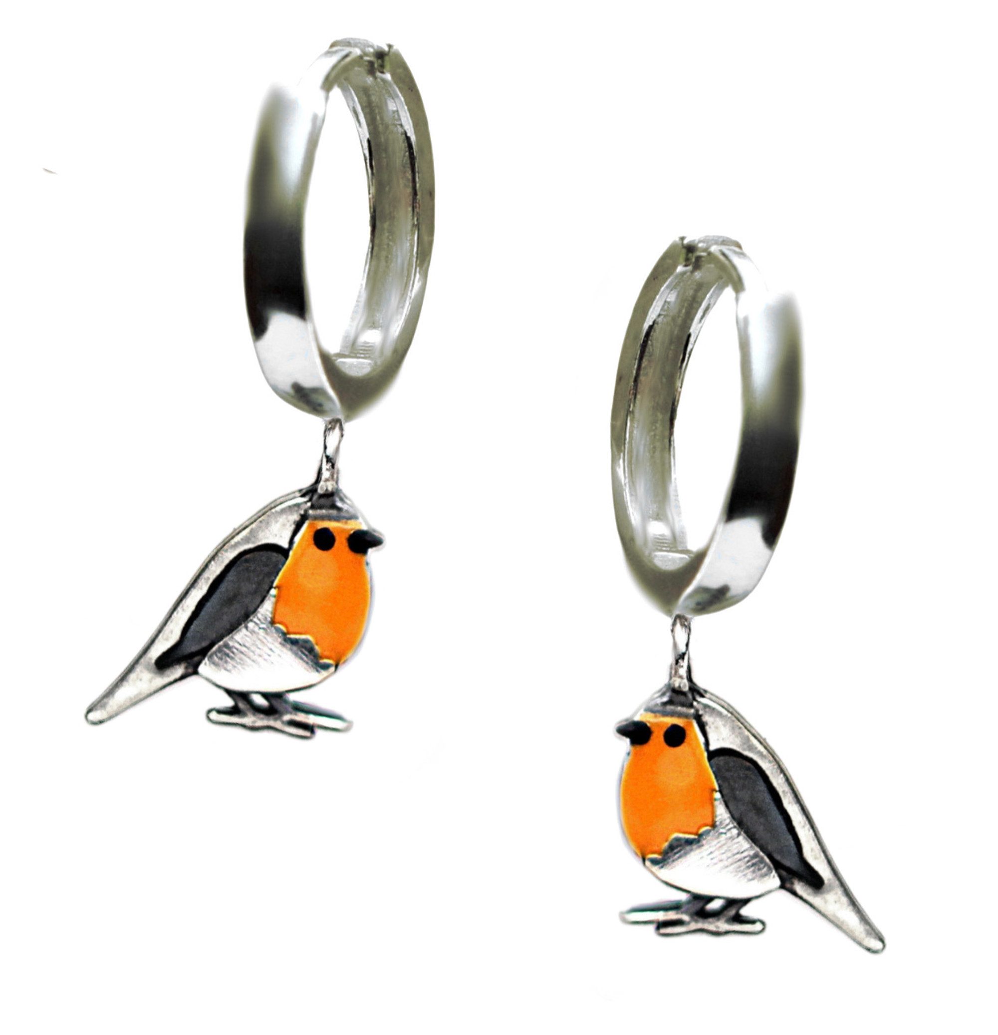 Feine Creolen aus 925 Sterling Silber mit einem kleinen Rotkehlchen als Anhänger. Das Vögelchen ist mit orangefarbener Emaille veredelt. Die Ohrringe sind wasserfest, nickelfrei und werden paarweise verkauft. Eingetragenes Design von Villa Sorgenfrei. • 925 Sterling Silber (nickelfrei, hypoallergen) • Rotkehlchen Anhänger mit Emaille in Orange • Creole mit Click Verschluss: ca. 14 mm • Vogelanhänger: ca. 14 mm lang • Wasserfest & alltagstauglich • Verkauf als Paar Unser exklusiv gestalteter Schmuck, handgefertigt in unserer kleinen Berliner Werkstatt, kommt immer in einer speziell gebrandeten, plastikfreien Verpackung. Mit Ihrem Kauf unterstützen Sie ein unabhängiges kleines Familienunternehmen. Mit der Verwendung von recycletem Silber, plastikfreier Verpackung sowie CO²-Kompensation schonen wir Umwelt und Klima. Zur eindeutigen Identifikation unseres Produkts dient die jeweils angegebene SKU-Artikelnummer sowie der Name und die Beschreibung des Schmuckstücks in diesem Angebot. Hersteller und Verkäufer des Schmuckstücks ist die Villa Sorgenfrei Schmuckmanufaktur Gmbh, Adresse und Kontaktinfo: Freienwalder Str. 17, 13055 Berlin, Tel. 030 3512 8209, Email villa@villamail.de; Verantwortlicher: Geschäftsführender Gesellschafter Dirk Dotzert.