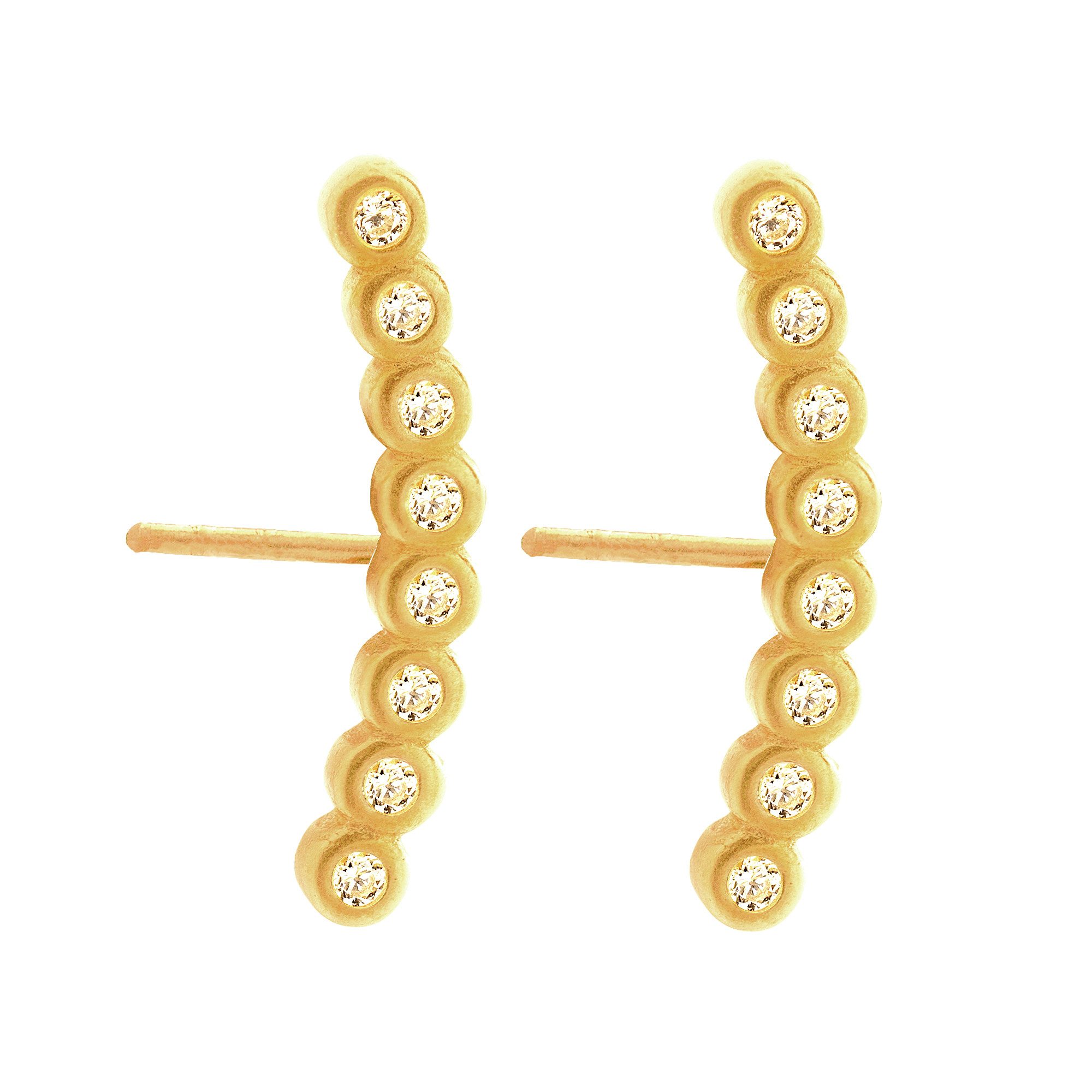 Asymmetrisches Paar Ohrstecker aus 925er Sterlingsilber mit dicker Echtgold Beschichtung (sog. Vermeil). Die leicht gebogene Form verläuft entlang des Ohrläppchens. Die Zirkoniasteine sind in runden Fassungen gefasst. Rückstecker, wenngleich nicht auf den Fotos, natürlich inklusive. Details: • Material: 925er Sterlingsilber • Vergoldung: 18k Gold Vermeil • Steine: Zirkonia • Form: Asymmetrisch gebogen • Größe: ca. 17 mm lang • Verschluss: Ohrstecker mit Flügelmutter • Oberfläche: Matt • Lieferung als Paar • Wasserfest und anlaufsicher Unser exklusiv gestalteter Schmuck, handgefertigt in unserer kleinen Berliner Werkstatt, kommt immer in einer speziell gebrandeten, plastikfreien Verpackung. Mit Ihrem Kauf unterstützen Sie ein unabhängiges kleines Familienunternehmen. Mit der Verwendung von recycletem Silber, plastikfreier Verpackung sowie CO²-Kompensation schonen wir Umwelt und Klima. Zur eindeutigen Identifikation unseres Produkts dient die jeweils angegebene SKU-Artikelnummer sowie der Name und die Beschreibung des Schmuckstücks in diesem Angebot. Hersteller und Verkäufer des Schmuckstücks ist die Villa Sorgenfrei Schmuckmanufaktur Gmbh, Adresse und Kontaktinfo: Freienwalder Str. 17, 13055 Berlin, Tel. 030 3512 8209, Email villa@villamail.de; Verantwortlicher: Geschäftsführender Gesellschafter Dirk Dotzert.