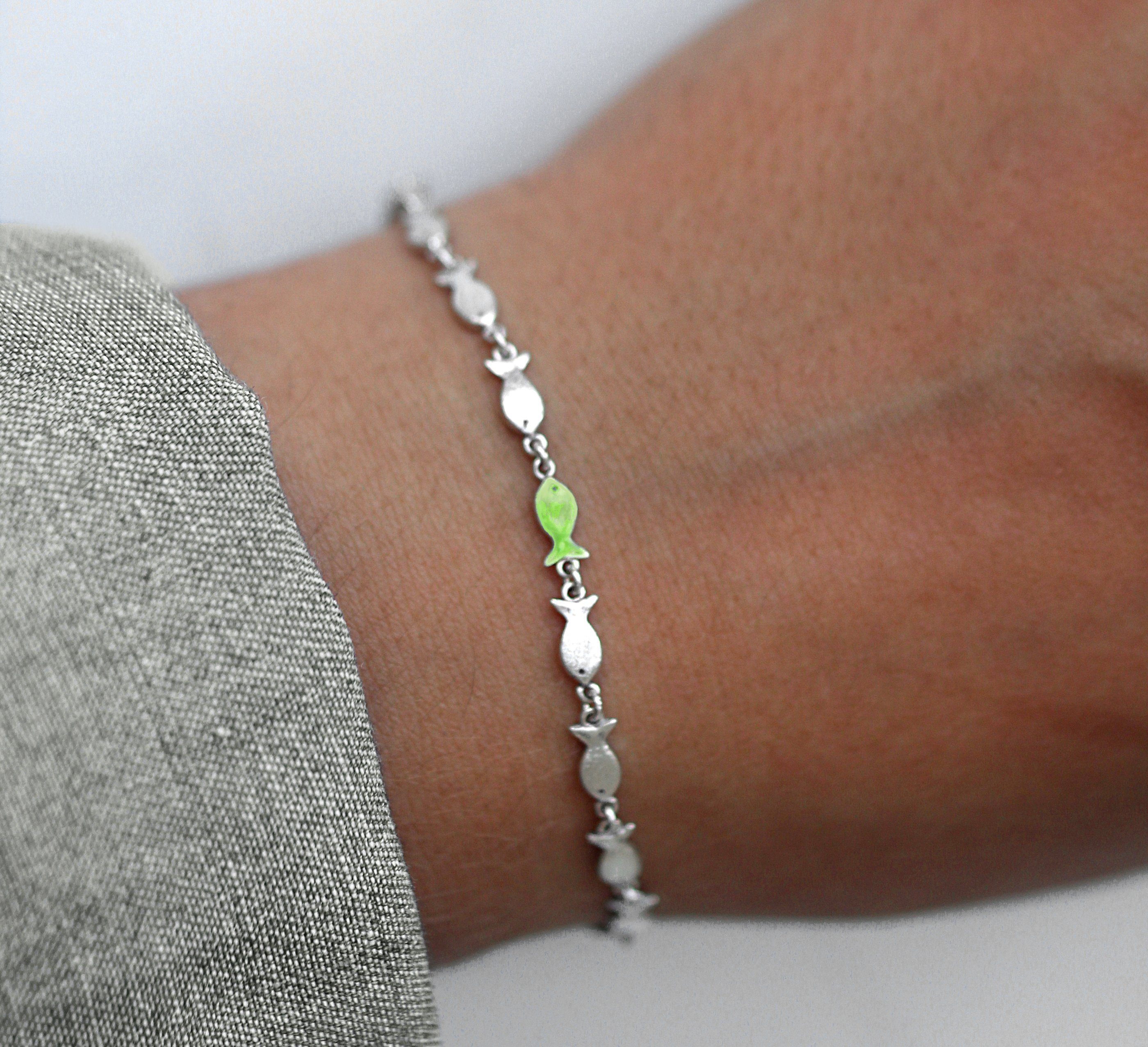 Manchmal, egal was, muss man gegen den Strom schwimmen.... so wie unser hellgrün emaillierter kleiner Freund hier :) Das robuste Armband ist aus Sterling Silber (gestempelt) und unser tapferer kleiner Held ist mit hellgrüner Emaille hervorgehoben. Gesamtlänge 20 cm. Wird mit Karabinerverschluss geschlossen und ist durch Verlängerungskettchen zwischen 15 und 20 cm verstellbar. -Hohe Qualität -Eingetragenes Design -Wasserdicht -Nickelfrei & hypoallergen Geschütztes eingetragenes Design. Unser exklusiv gestalteter Schmuck, handgefertigt in unserer kleinen Berliner Werkstatt, kommt immer in einer speziell gebrandeten, plastikfreien Verpackung. Mit Ihrem Kauf unterstützen Sie ein unabhängiges kleines Familienunternehmen. Mit der Verwendung von recycletem Silber, plastikfreier Verpackung sowie CO²-Kompensation schonen wir Umwelt und Klima. Zur eindeutigen Identifikation unseres Produkts dient die jeweils angegebene SKU-Artikelnummer sowie der Name und die Beschreibung des Schmuckstücks in diesem Angebot. Hersteller und Verkäufer des Schmuckstücks ist die Villa Sorgenfrei Schmuckmanufaktur Gmbh, Adresse und Kontaktinfo: Freienwalder Str. 17, 13055 Berlin, Tel. 030 3512 8209, Email villa@villamail.de; Verantwortlicher: Geschäftsführender Gesellschafter Dirk Dotzert.