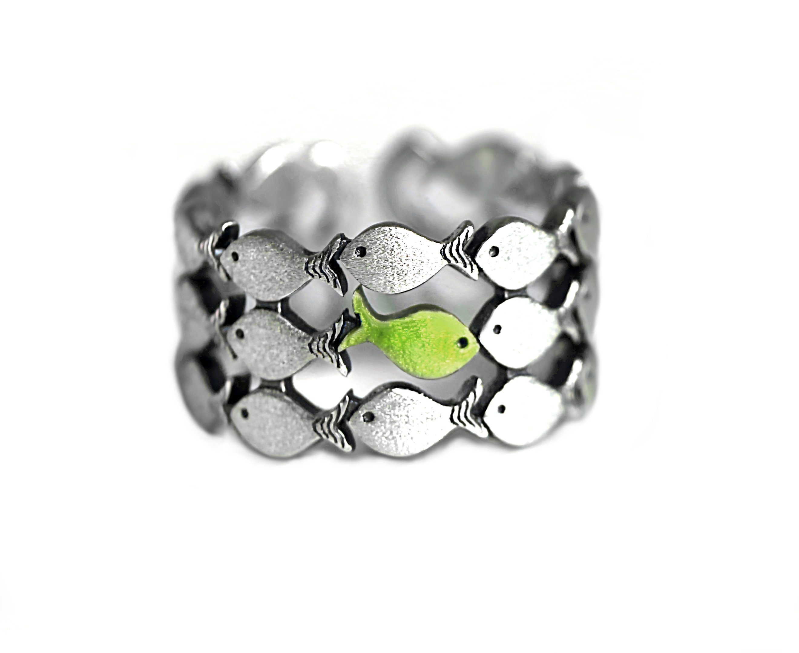Stellen Sie sich mit diesem exklusiven Originalring gegen den Strom. JETZT auch mit grünen Fischen. Der Ring besteht aus Sterlingsilber (Punze) und unser tapferer kleiner Held, der gegen den Strom schwimmt, wird durch hellgrüne Emaille hervorgehoben. Auf diese Weise ist der Ring langlebig, wasserdicht und nicht allergen. Der Ring ist verstellbar und wir haben ihn in drei Grundgrössen: XS-M: passt im Allgemeinen allen, die diese Konfektionsgrößen tragen (für diejenigen, die Ringgrößen kennen: verstellbar von 52-57) M/L: passt jedem, der generell diese Größen trägt (für diejenigen, die Ringgrößen kennen: verstellbar von 58-62) L/XXL: passt jedem, der generell diese Größen trägt (für Kenner von Ringgrößen: verstellbar von 63-69 ) MÄNNER: Размер 11 ist die gängigste Herrenringgröße. Wählen Sie daher bitte die L/XXL-Version. Geschütztes eingetragenes Design. Meine Originalkreationen sind eingetragene Markenzeichen und durch internationale Urheberrechtsgesetze geschützt. К сожалению, stehen, wie bei vielen erfolgreichen Designobjekten, weltweit gefälschte Versionen unserer Artikel zum Verkauf. Wir bitten Sie dringend, die Fälschungen nicht zu kaufen, da sie von minderer Qualität sind (und in vielen Fällen nicht einmal echtes Silber) und der Kauf nicht nur unsere Rechte verletzt, sondern sich auch negativ auf unsere Lebensgrundlage auswirkt. Vielen Dank für Ihre Mitarbeit und Unterstützung! Mit der Verwendung von recycletem Silber, plastikfreier Verpackung sowie CO²-Kompensation schonen wir Umwelt und Klima. Zur eindeutigen Identifikation unseres Produkts dient die jeweils angegebene SKU-Artikelnummer sowie der Name und die Beschreibung des Schmuckstücks in diesem Angebot. Hersteller und Verkäufer des Schmuckstücks ist die Villa Sorgenfrei Schmuckmanufaktur Gmbh, Adresse und Kontaktinfo: Freienwalder Str. 17, 13055 Berlin, Tel. 030 3512 8209, Email villa@villamail.de; Verantwortlicher: Geschäftsführender Gesellschafter Dirk Dotzert.
