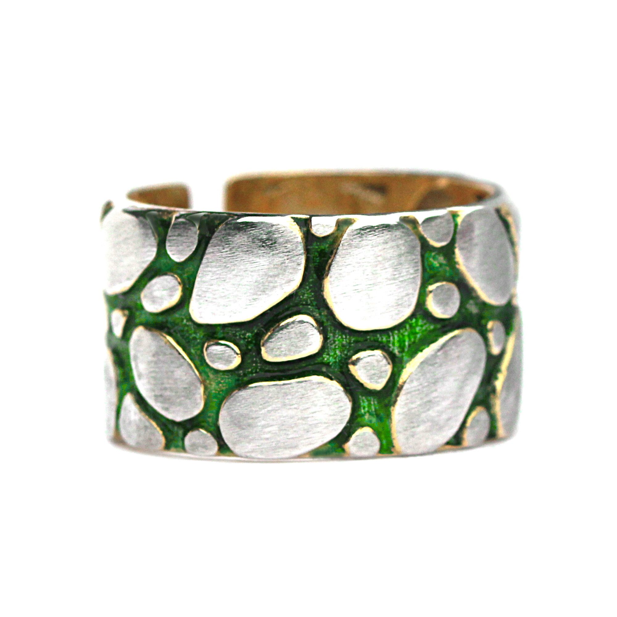 Handgefertigter Silberring mit organischer Kieselstruktur, grünem Emaille-Hintergrund und dezenten Goldakzenten. Merkmale: - 925 Sterling Silber mit grünem Emaille & dezenten Goldakzenten - Eigenes, geschütztes Design von Villa Sorgenfrei - Wasserfest & nickelfrei – ideal für den Alltag Der Ring ist innerhalb folgender Größen verstellbar: XS-M: passt Frauen, die im Allgemeinen diese Konfektionsgrößen tragen (für diejenigen, die Ringgrößen kennen: verstellbar von 52-57) M-XL: passt Frauen, die generell diese Größen tragen (für diejenigen, die sich mit Ringgrößen auskennen: verstellbar von 57-62) UND PASST „normalen“ MÄNNERHÄNDEN. Die durchschnittliche Ringgröße für Männer beträgt 60. Unser exklusiv entworfener Schmuck, handgefertigt in unserer kleinen Berliner Werkstatt, kommt immer in einer speziell gebrandeten, plastikfreien Verpackung. Mit Ihrem Kauf unterstützen Sie ein unabhängiges kleines Familienunternehmen. Mit der Verwendung von recycletem Silber, plastikfreier Verpackung sowie CO²-Kompensation schonen wir Umwelt und Klima. Zur eindeutigen Identifikation unseres Produkts dient die jeweils angegebene SKU-Artikelnummer sowie der Name und die Beschreibung des Schmuckstücks in diesem Angebot. Hersteller und Verkäufer des Schmuckstücks ist die Villa Sorgenfrei Schmuckmanufaktur Gmbh, Adresse und Kontaktinfo: Freienwalder Str. 17, 13055 Berlin, Tel. 030 3512 8209, Email villa@villamail.de; Verantwortlicher: Geschäftsführender Gesellschafter Dirk Dotzert.