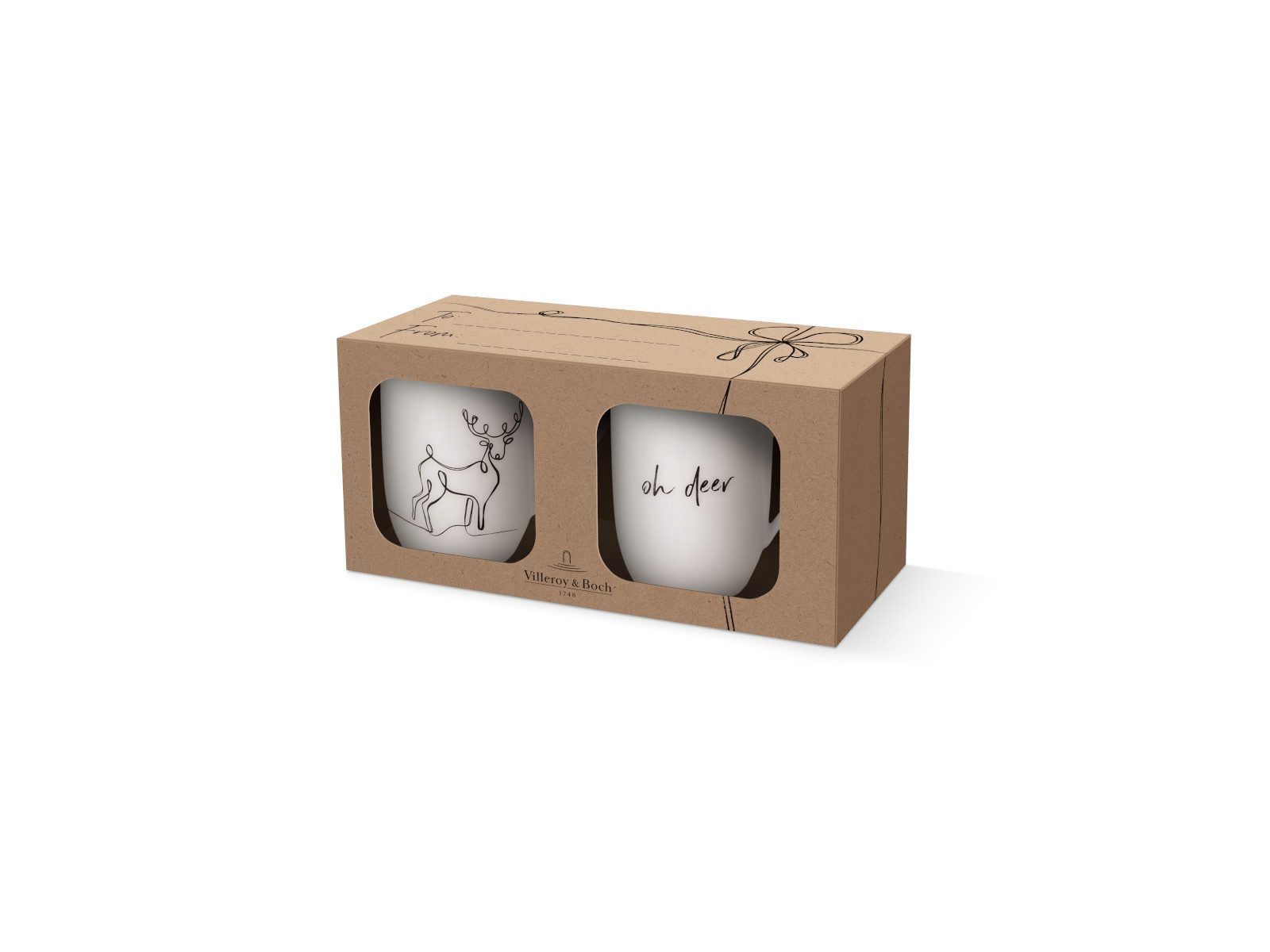 Das Villeroy & Boch Statement Henkelbecher Set "Rentier XMAS" umfasst zwei wunderschöne Becher, die perfekt für die Weihnachtszeit geeignet sind. Mit einer Füllmenge von 0,29 Litern und Maßen von 11,5 x 8 x 10,4 cm bieten diese Becher genau die richtige Размер für Ihren Lieblingskaffee, Tee oder heiße Schokolade. Hergestellt aus hochwertigem Premium Porcelain, sind die Becher sowohl spülmaschinenfest als auch mikrowellensicher, was sie äußerst praktisch für den täglichen Gebrauch macht. Das Set besteht aus zwei unterschiedlichen Designs: Auf einem Becher ist in eleganter schwarzer Farbe ein Rentier abgebildet, das für die festliche Jahreszeit steht, während der andere Becher mit dem humorvollen Schriftzug "oh deer" verziert ist. Dieses Set ist nicht nur ein Hingucker in Ihrer eigenen Küche, sondern auch eine ausgezeichnete Geschenkidee für Freunde und Familie, die den Charme der Weihnachtszeit lieben. Die Kombination aus hochwertiger Verarbeitung und stilvollem Design macht die Villeroy & Boch Henkelbecher zu einem Must-Have für jeden Haushalt in der festlichen Saison.