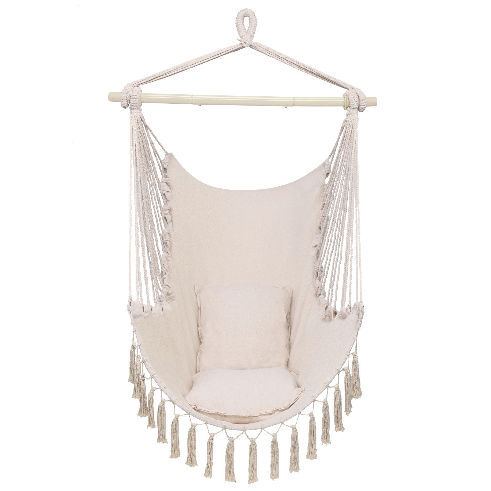 Unser Hängesessel indoor ist eine perfekte Wahl für entspannte Momente, ob drinnen oder draußen. Mit einer stabilen Konstruktion, bestehend aus einem robusten Holzstab und festen, dunkelgrauen Seilen mit soliden Knoten, gewährleistet er eine sichere und stabile Aufhängung. Das stylische Design, geprägt von hängenden Fransen an der Unterkante des Sitzteils und feinen Webmustern der Seile, verleiht ihm einen modernen und lässigen Look. Mit einer Breite von ca. 80 cm und einer Höhe von ca. 120 cm bietet er ausreichend Platz für bequeme Sitz- oder Liegewelten. Der Sitzbereich ist mit zwei dunklen, weichen Kissen – einem Rückenkissen und einem Sitzkissen – ausgestattet, die den Komfort deutlich erhöhen und stilistisch perfekt zum Gesamtdesign passen. Egal, ob auf der Terrasse neben einem Pool oder als gemütliche Ecke im Wohnzimmer, dieser Hängeschaukel eignet sich ideal für verschiedene Settings und schafft eine entspannte Atmosphäre.