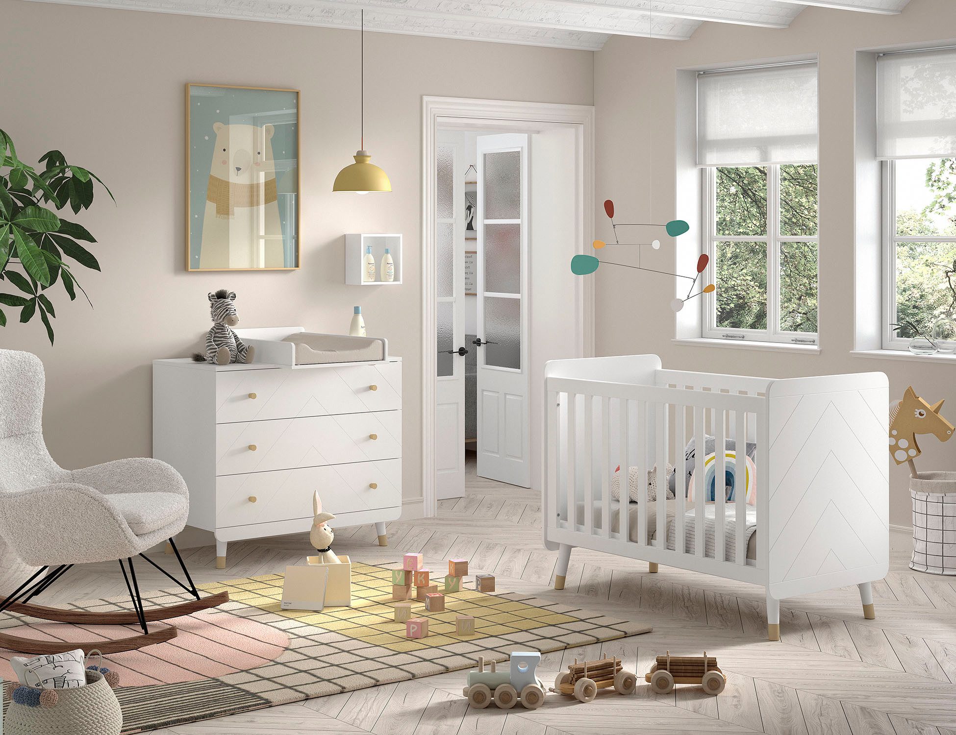 Hinweis Lieferumfang | Inkl. Babybett Maß ca.: B: 123,6 x H: 96 x T: 68 cm Inkl. Schubladenkommode Maß ca.: B: 100 x H: 89 x T: 57 cm Inkl. Wickelaufsatz Maß ca.: B: 53 x H: 14 x T: 74 Ohne Wickelauflage |
