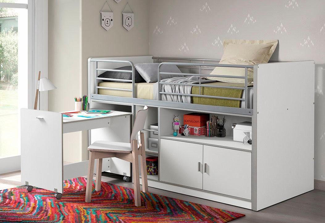 Wissenswertes | Ein schickes und funktionelles Spielbett für jedes Kinderzimmer. Die Baugruppen sind aus Holzwerkstoff und hochwertigem MDF, Dekor beschichtet. Die Kanten sind in grau abgesetzt. Liegeflächensicherung als Absturzschutz erfolgt durch Metallverstrebungen an der Vorder- und Rückseite. Im Einstiegsbereich ist der Absturzschutz abgerundet. Unter der Liegefläche befindet sich ein ausziehbarer Schreibtisch auf Rollen. Hinter der Leiter zum Bettaufstieg befindet sich ein geräumiges Regal mit einem Boden. Rechts daneben befinden sich 2 Türen. Das längliche Fach über den Türen bietet noch viel Ablagefläche. Als Matratzenauflage dienen 5 stabile Bodenplatten. Matratze bitte separat bestellen. Details:
