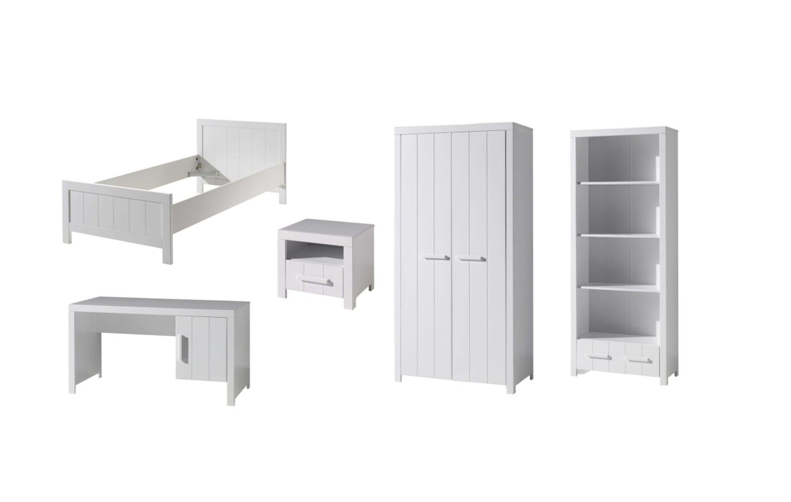 Lieferumfang | Set Erik bestehend aus: Einzelbett 90 x 200, Nachtkonsole, Kleiderschrank 2-trg., Schreibtisch, Regal |