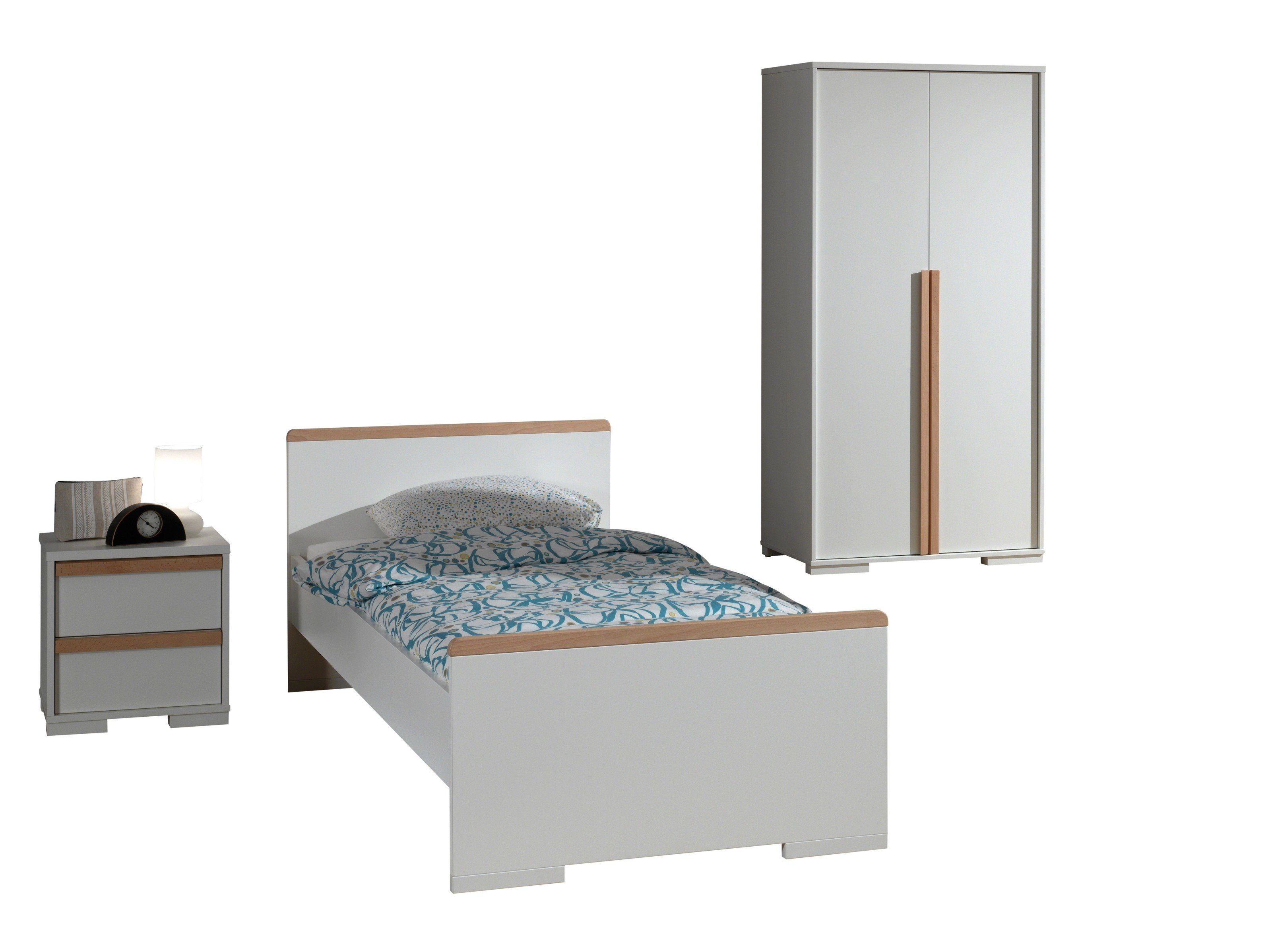 Lieferumfang | LONDON Jugendzimmer Set 3-tlg. best. aus: Einzelbett LF 90 x 200 cm, Nachtkonsole mit 2 Schubladen, Kleiderschrank 2-trg., Ausf. Dekor Weiß, Absatz Buche natur massiv |