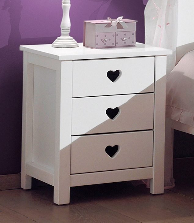 Wissenswertes | Süßes Jugendzimmerprogramm mit herzförmigen Ausschnitten. Fronten und Seiten in Rahmen-Optik. Aus FSC®-zertifiziertem MDF (Holzwerkstoff), weiß lackiert. Innendekor weiß. Beschläge aus Metall. Mit 3 Schubkästen (Innenmaße, B/T/H: 33/30/13 cm). Schubkästen auf Metalllaufleisten. Gesamtmaße (B/T/H): 50/45/55 cm. Все Maße sind ca.-Maße. Mit Aufbauanleitung. |