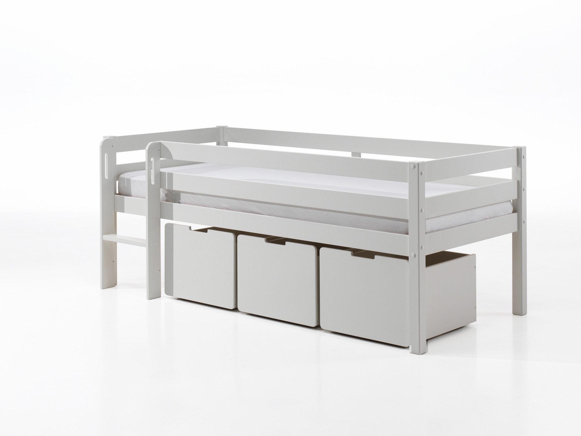 Lieferumfang | Kojen-Spielbett mit Liegefläche 90 x 200 cm, inkl. Leiter, Regal, Rolllattenrost und 3 Schubkästen, Kiefer und MDF weiß lackiert |