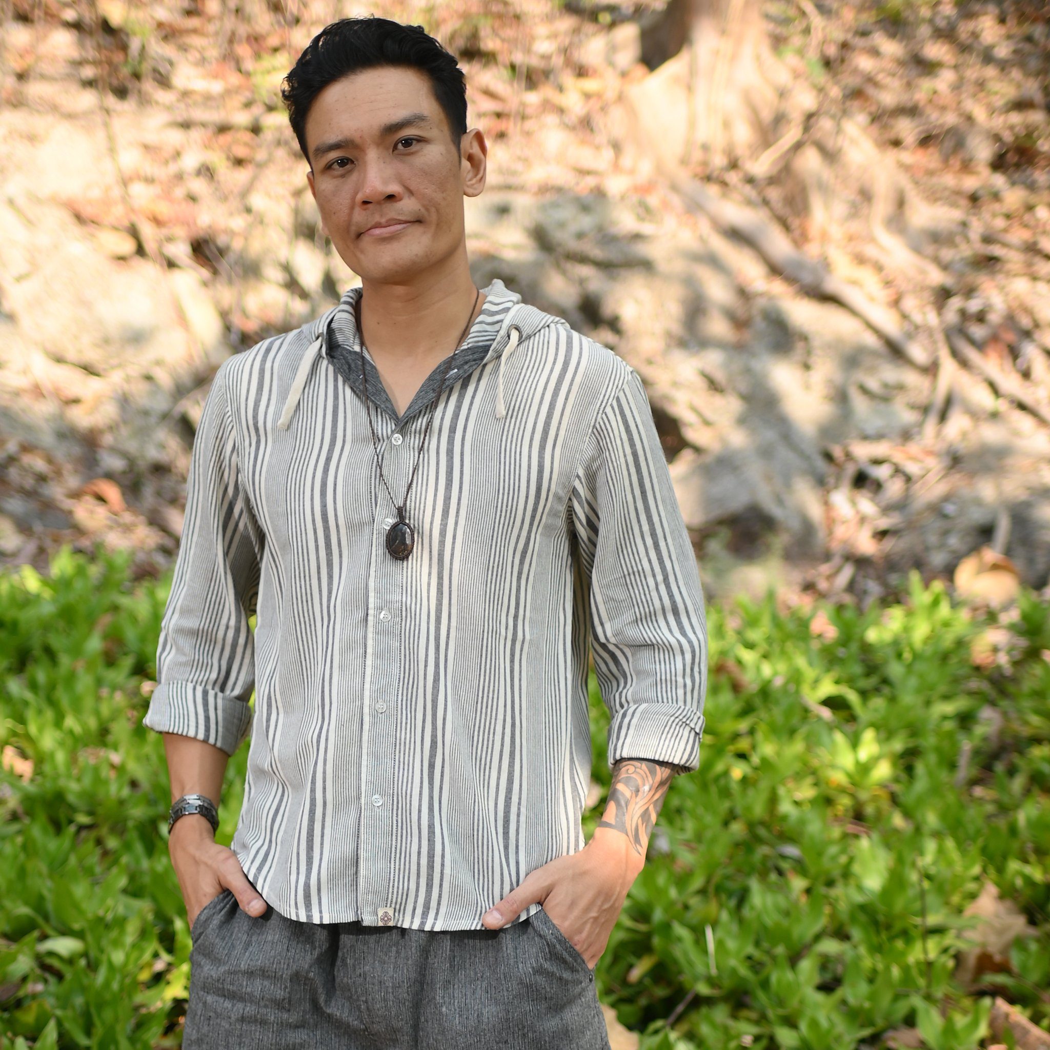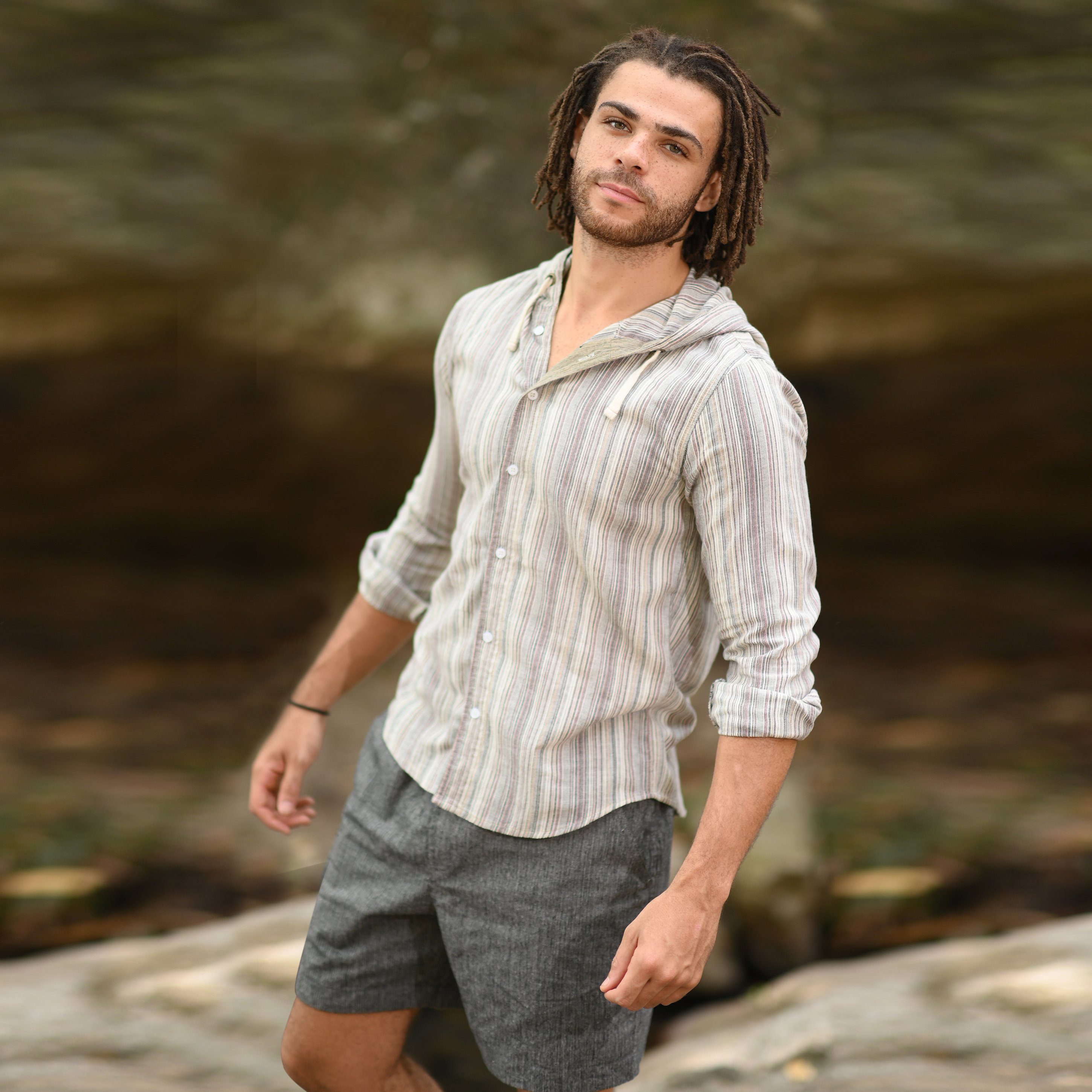 Optik | Sommerhemd Herren, gestreift, unifarben, Hippie Hemd Herren, Hemd mit Kapuze |