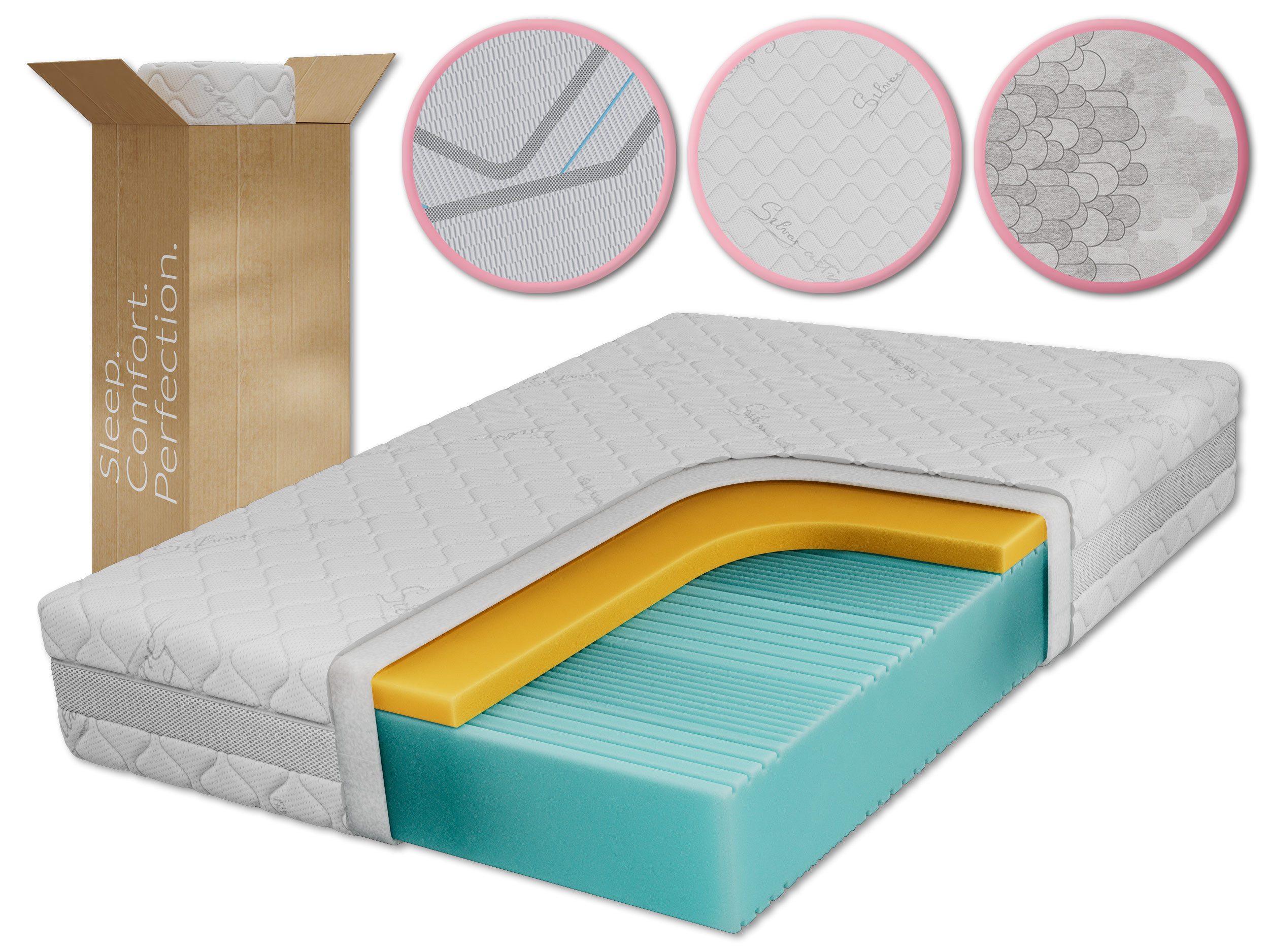 Die Schaummatratze Miro mit Sivo-Bezug bietet ergonomische Unterstützung, hygienische Schlafbedingungen und hohen Komfort – ideal für Всеrgiker und empfindliche Haut. Der Aufbau kombiniert drei hochwertige Schaumarten: thermoelastischer Visco-Schaum, flexibler HR-Kaltschaum und eine profilierte Massage-Oberfläche. Das Ergebnis: gezielte Druckentlastung, punktgenaue Anpassung und gesunde Ausrichtung der Wirbelsäule.