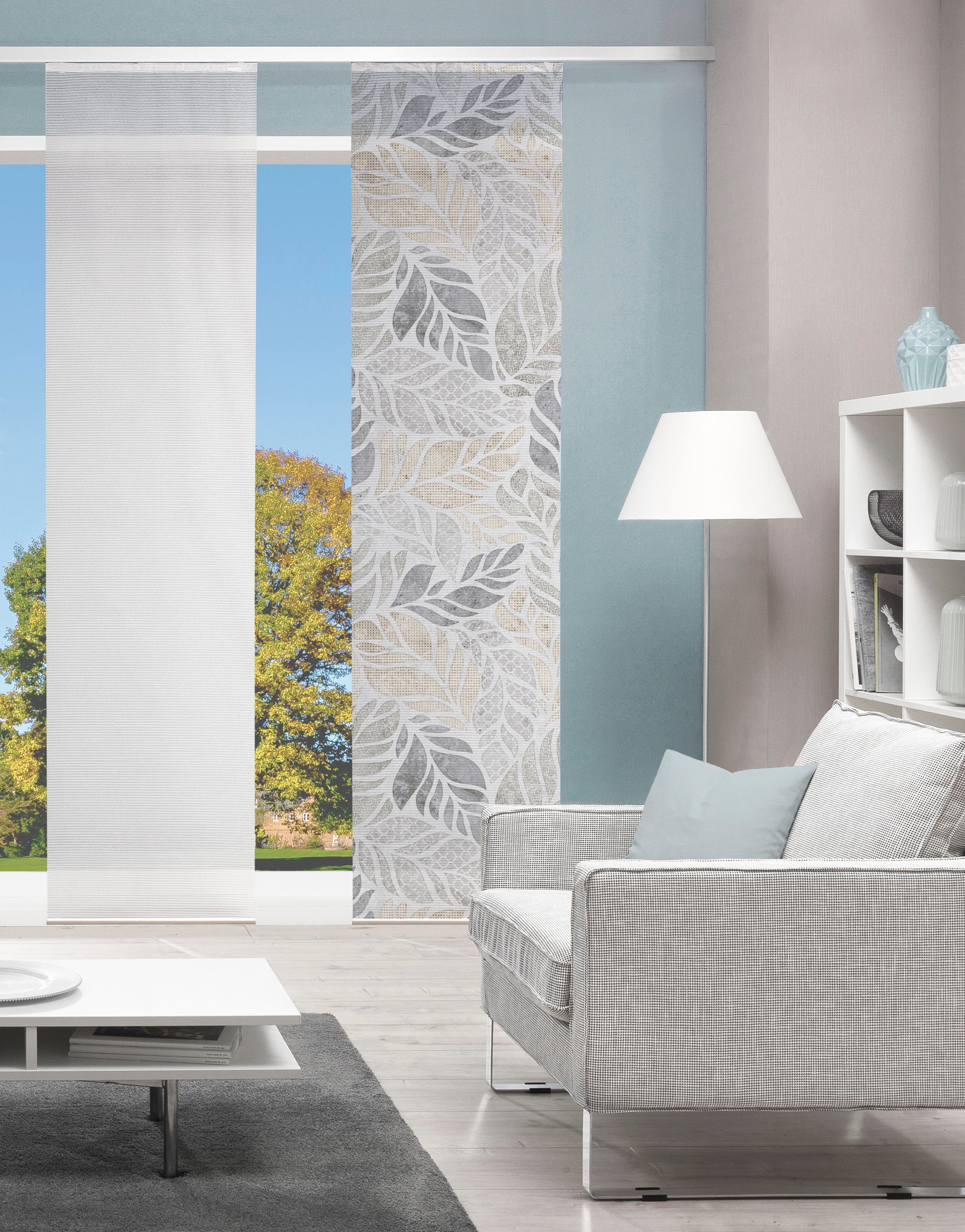Hinweis Dekoration | Die angegebenen Maße sind die fertig dekorierten Maße. Eine Schiebegardine ist eine schmale, glatt hängende Stoffbahn, die sich sowohl als Sichtschutz als auch zur Raumteilung eignet. Durch die Schiebetechnik sind Schiebegardinen sehr flexibel einsetzbar. |