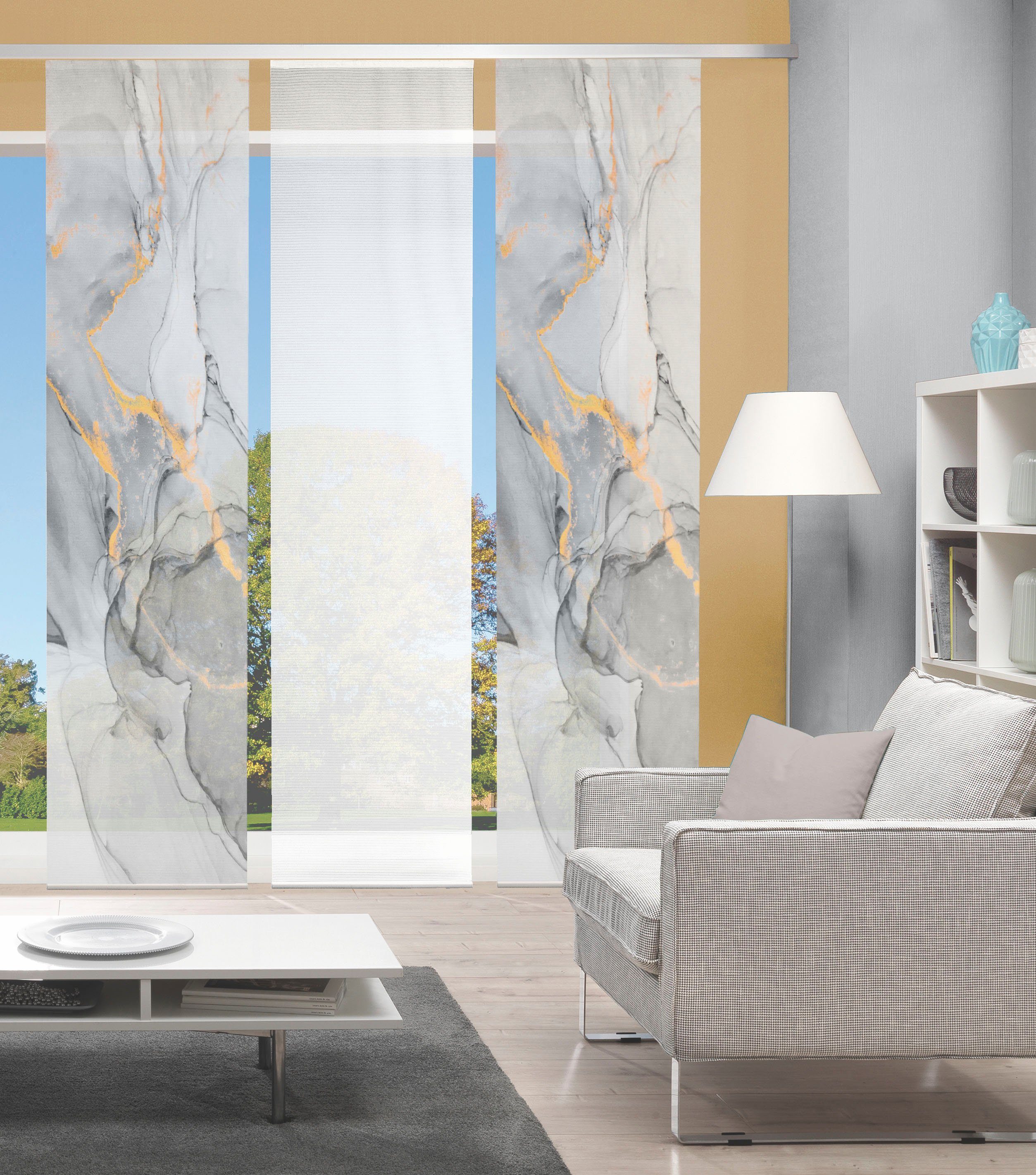 Hinweis Dekoration | Die angegebenen Maße sind die fertig dekorierten Maße. Eine Schiebegardine ist eine schmale, glatt hängende Stoffbahn, die sich sowohl als Sichtschutz als auch zur Raumteilung eignet. Durch die Schiebetechnik sind Schiebegardinen sehr flexibel einsetzbar. |