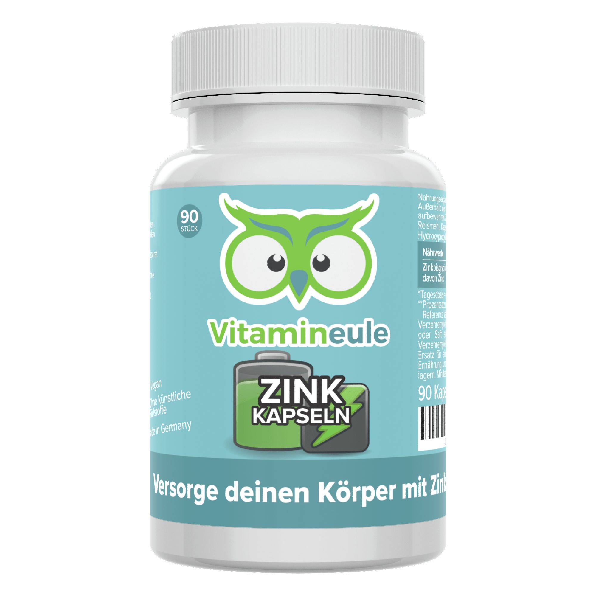 In unserem Onlineshop kannst du unsere Vitamineule® Zink Kapseln kaufen, die komplett frei von künstlichen Zusatzstoffen sind und ausschließlich in Deutschland produziert werden. Die Zink Kapseln sind hochdosiert und enthalten ausschließlich bioverfügbares Zinkbisglycinat, das vom Körper besonders gut verwertet werden kann.