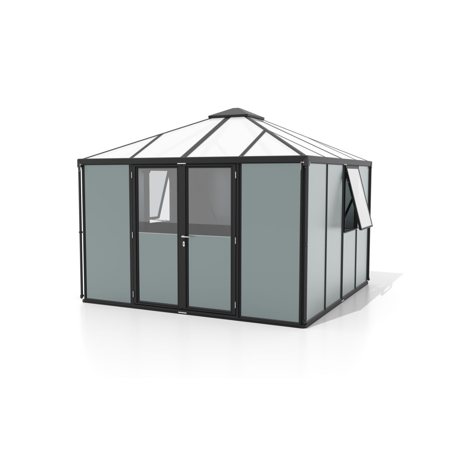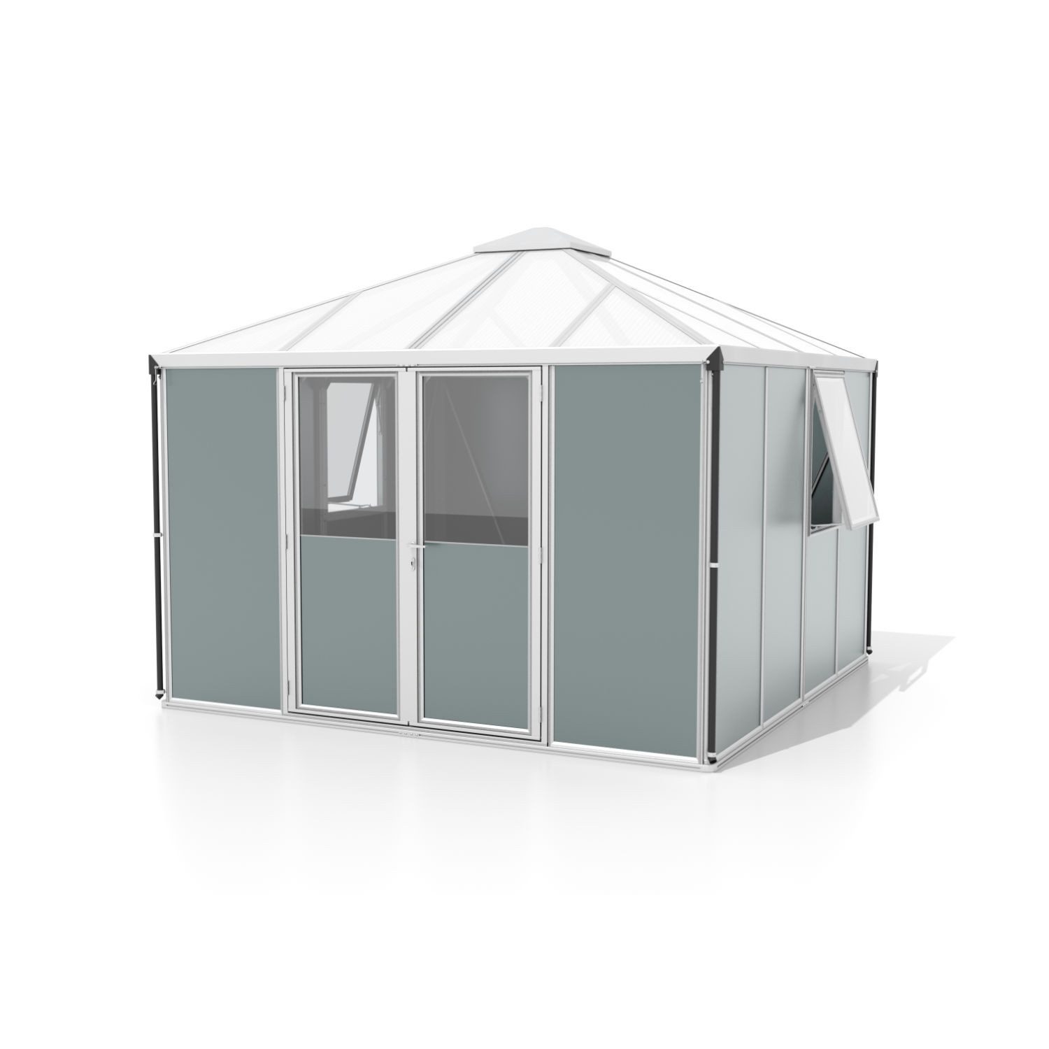 Premiumgerätehaus mit Pavillondach Ähnlich wie beim Blick in den nächtlichen Himmel vermehren sich bei der Betrachtung dieses 10,2 Quadratmeter großen Werk- und Lagerraums auf fast bezaubernde Art die Hingucker, wie am Firmament die Sterne: Robust und fein zugleich bilden die verschraubten Doppelrahmenprofile aus eloxiertem Aluminium den schlanken Rahmen. Ausgekleidet wird er im Dach mit UV-beschichtetem Hohlkammerplatten, in den Seiten mit kristallklarem Sicherheitsglas (ESG) und stabilen Alu-Sandwich-Paneelen in mattem Salbei-Grau: Die perfekte Mischung an Diskretion, Ästhetik und Tageslicht. So sind die Türen oberhalb der Türklinke verglast, unterhalb geschlossen – und außerdem abschließbar, weit zu öffnen und mit einer klassischen Türklinke ausgestattet. Die Hohlkammerplatten im Dach lassen viel Tageslicht in das Universum, in dem daher Verstautes schnell gefunden wird und Werkarbeiten ohne elektrisches Licht kein Problem sind, solange es draußen hell ist. Die UV-Beschichtung gewährleistet, dass Gelagertes und auch die Platten selbst nicht unter den einfallenden Sonnenstrahlen leiden. Und gelagert werden kann viel, da die 10,2 Quadratmeter mit 1,88 m hohen Seiten umbaut sind. Auf die setzt sich das bis zu 2,65 m hohe Dach im Pavillonstil, den Blick freigebend in den echten Sternenhimmel. Das Universum wird als Bausatz und ohne Boden geliefert. Produktdetails Seiten mit robusten Alu Sandwich-Paneelen in den Seiten, HKP ca. 10 mm im Dach und ESG ca. 3 mm in den Fenstern Aluminium-Türklinke und Zylinderschloss wie an Ihrem Hauseingang eloxierte oder pulverbeschichtete Aluminiumprofile sorgen für dauerhaften Schutz vor Korrosion inkl.: Regenrinnen, Regenfallrohre Grundfläche: ca. 10,2 m²