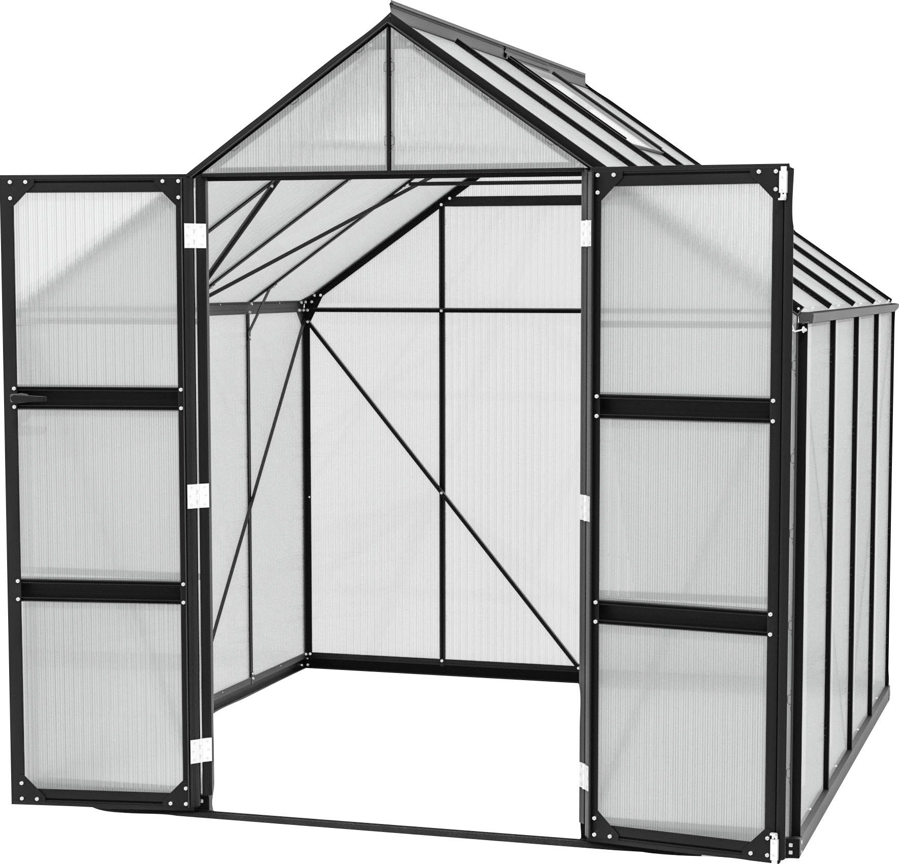 Weite und fast zwei Meter hohe Doppelflügeltüren sowie eine bodentiefe Türschwelle laden Hobbygärtner und Gäste geradezu ein, in diese großzügige Werkstätte mit dem Plus an Komfort einzutreten. Ob mit kristallklarem Sicherheitsglas (ESG) oder UV-stabilen Hohlkammerplatten - erhältlich in 4mm und 6 mm Stärke - verglast: Die Scheiben bzw. Platten erstrecken sich großflächig über die Seitenfelder. Welche Verglasung gewählt wird, entscheiden die Gärtner selbst: Komplett mit dem 3mm starken, bruchstabilen Sicherheitsglas ausgestattet, fügt sich ihr Domus elegant und wertig in ihren Garten – und bietet den Pflanzen viel Sonne. Das ist gut fürs Wachstum, erfordert aber je nach Sonneneinstrahlung auch den Einsatz von Schattierhilfen, um den Brennglaseffekt zu vermeiden. Wer sich darum nicht kümmern möchte, entscheidet sich für eine Варианты mit Hohlkammerplatten. Diese verbessern zudem die Isoliereigenschaften, sodass z.B. am Anfang und zum Ende der Gartensaison effizienter zugeheizt werden kann. Egal, ob in 4mm oder in 6 mm Stärke: Bei den Hohlkammerplatten können sich Kunden von Vitavia auf qualitativ hochwertiges Material verlassen: Die Polycarbonatplatten aus deutscher Herstellung sind aufgrund ihrer UV-Beschichtung haltbarer als herkömmliche Platten, und sind an den Längsseite geschlossen. So kann weniger Feuchtigkeit oder Schmutz eindringen, und die Kontaktpunkte zum Gewächshausprofil sind stabiler, weil am Rand keine Hohlkammern offen stehen, die leicht eingedrückt werden könnten. Das Domus ist in vier verschiedenen Größen mit Grundflächen von 6,7 bis 11,5 Quadratmetern und in drei verschiedenen Farben erhältlich. Zwei Dachfenster, Regenrinne und der Stahlfundamentrahmen gehören zur Serienausstattung.