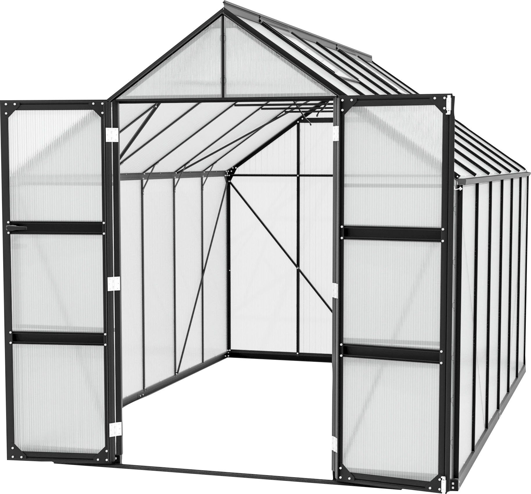 Weite und fast zwei Meter hohe Doppelflügeltüren sowie eine bodentiefe Türschwelle laden Hobbygärtner und Gäste geradezu ein, in diese großzügige Werkstätte mit dem Plus an Komfort einzutreten. Ob mit kristallklarem Sicherheitsglas (ESG) oder UV-stabilen Hohlkammerplatten - erhältlich in 4mm und 6 mm Stärke - verglast: Die Scheiben bzw. Platten erstrecken sich großflächig über die Seitenfelder. Welche Verglasung gewählt wird, entscheiden die Gärtner selbst: Komplett mit dem 3mm starken, bruchstabilen Sicherheitsglas ausgestattet, fügt sich ihr Domus elegant und wertig in ihren Garten – und bietet den Pflanzen viel Sonne. Das ist gut fürs Wachstum, erfordert aber je nach Sonneneinstrahlung auch den Einsatz von Schattierhilfen, um den Brennglaseffekt zu vermeiden. Wer sich darum nicht kümmern möchte, entscheidet sich für eine Варианты mit Hohlkammerplatten. Diese verbessern zudem die Isoliereigenschaften, sodass z.B. am Anfang und zum Ende der Gartensaison effizienter zugeheizt werden kann. Egal, ob in 4mm oder in 6 mm Stärke: Bei den Hohlkammerplatten können sich Kunden von Vitavia auf qualitativ hochwertiges Material verlassen: Die Polycarbonatplatten aus deutscher Herstellung sind aufgrund ihrer UV-Beschichtung haltbarer als herkömmliche Platten, und sind an den Längsseite geschlossen. So kann weniger Feuchtigkeit oder Schmutz eindringen, und die Kontaktpunkte zum Gewächshausprofil sind stabiler, weil am Rand keine Hohlkammern offen stehen, die leicht eingedrückt werden könnten. Das Domus ist in vier verschiedenen Größen mit Grundflächen von 6,7 bis 11,5 Quadratmetern und in drei verschiedenen Farben erhältlich. Zwei Dachfenster, Regenrinne und der Stahlfundamentrahmen gehören zur Serienausstattung.