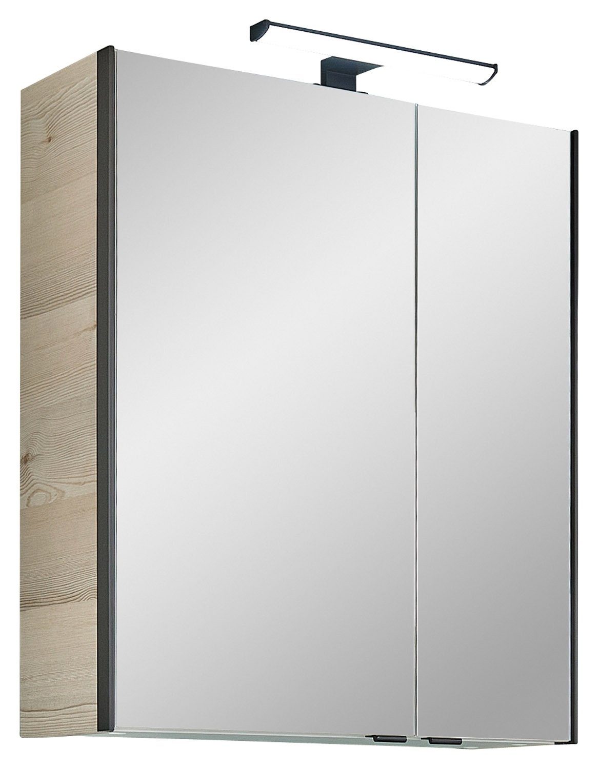 Lieferumfang | 1 Spiegelschrank mit LED-Aufsatzleuchte, 2 Türen und 2 Einlegeböden |