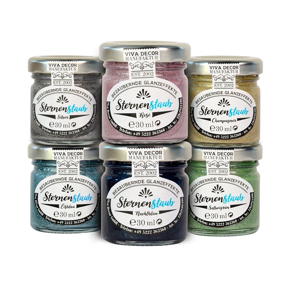 Das Viva Decor Sternenstaub „Bezaubernde Glanzeffekte“ Set mit sechs verschiedenen Farben ist für schimmernde Gestaltungsmöglichkeiten auf Papier, Kunststoff und Glas geeignet. Die Farben auf Wasserbasis sind auch als Stempelfarbe geeignet. Die Paste auf einen staub- und fettfreien Untergrund auftragen. Für eine glatte Optik einen Flachpinsel verwenden, für eine strukturierte Optik einen Tupfschwamm. So werden im Handumdrehen tolle Akzente auf Vasen, Grußkarten und Co. gesetzt.