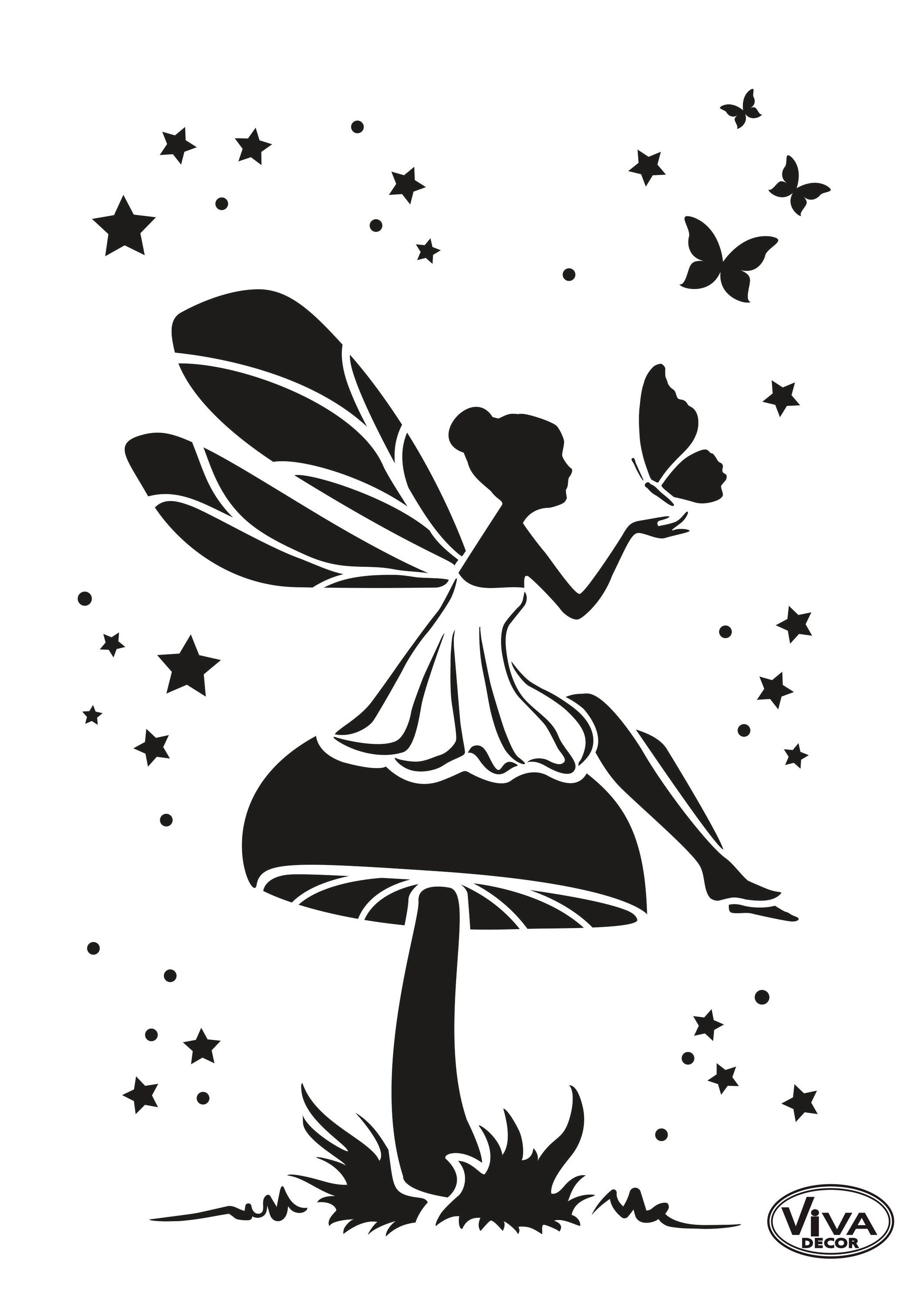 Niedliche Schablone 'Elfe und Pilz', DIN A4, aus gelaserter, halbtransparenter Folie. Die Schablone hat eine Motivgröße von ca. 21 x 15 cm (ohne Sterne/Schmetterlinge) und lässt sich mehrfach verwenden. Hervorragend für alle Schablonier-Techniken geeignet.