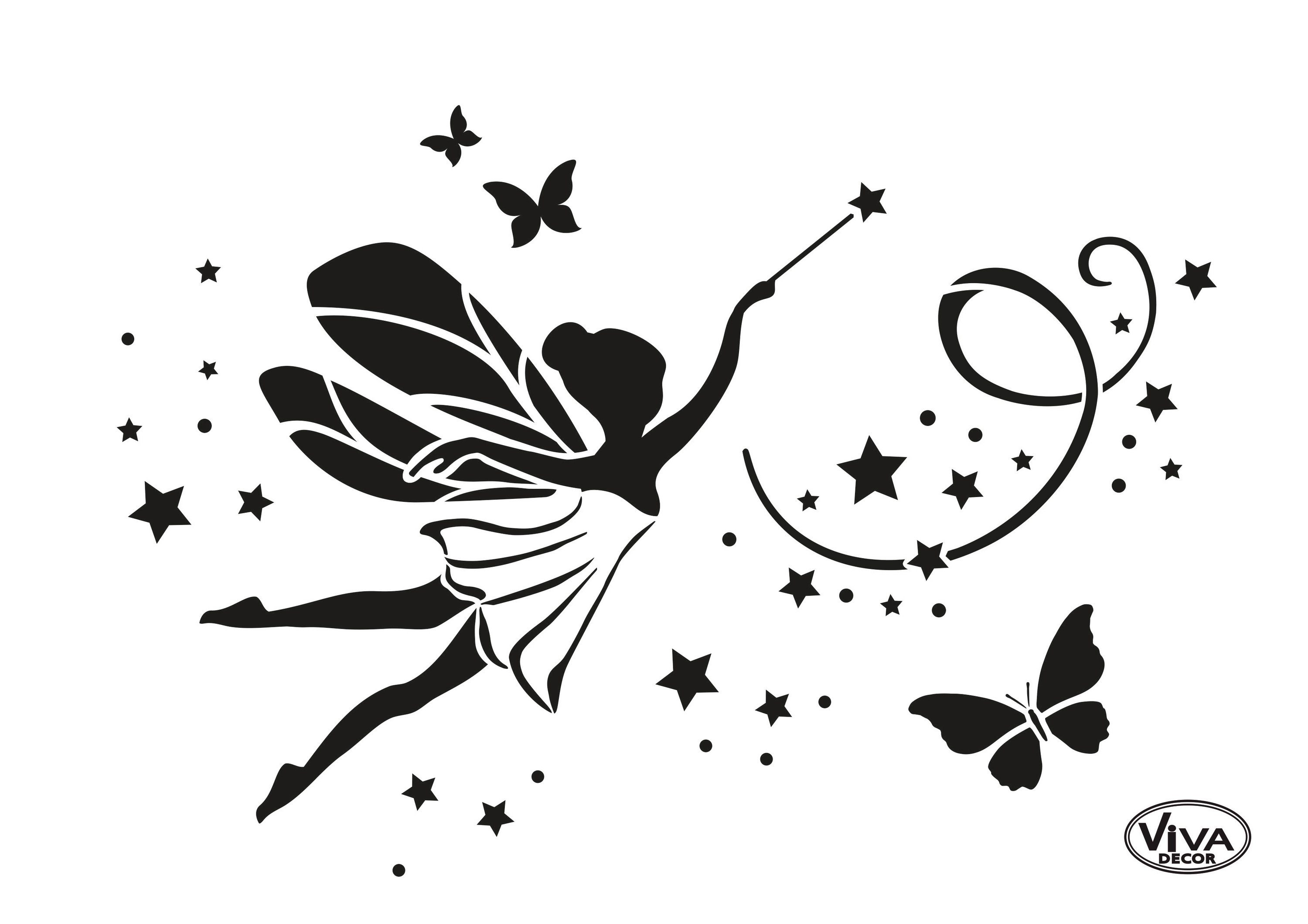 Schöne Schablone 'Elfenzauber' im DIN A4 Format, mit einem niedlichen Elfenmotiv, welches von Sternen und Schmetterlingen umgeben ist. Lassen Sie sich von dieser gelaserten, aus halbtransparenter Folie gefertigten Schablone verzaubern und gestalten Schranktüren, Fensterscheiben oder Holzgegenstände mit den verschiedensten Schablonier-Techniken.