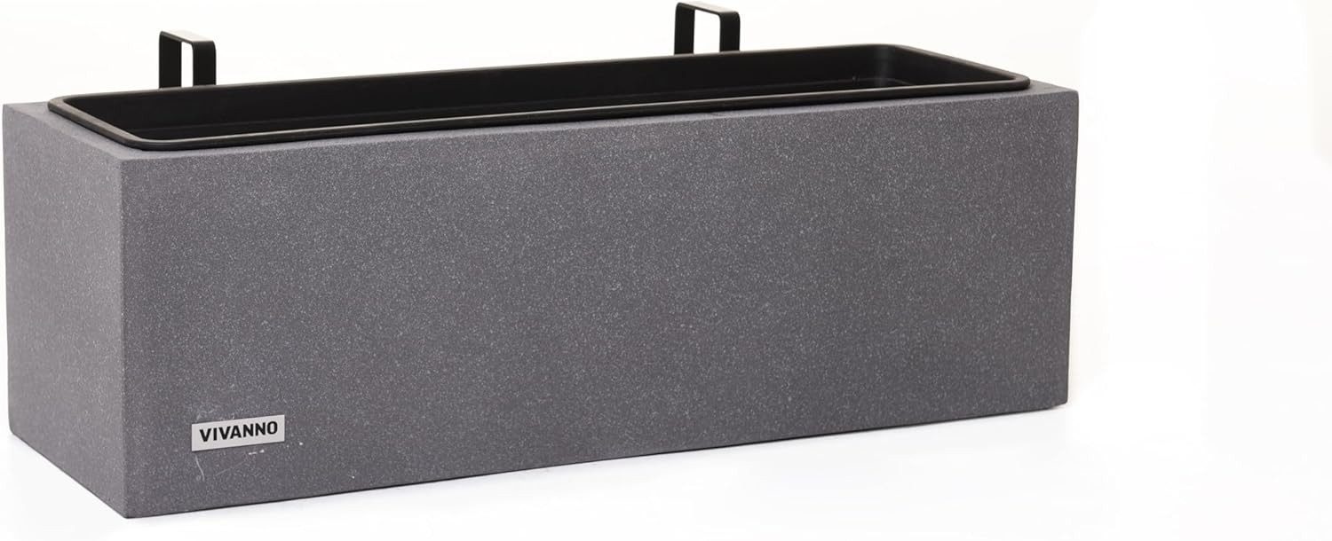 - moderner Balkonkasten zum Aufhängen am Geländer - Blumenkasten gefertigt aus Fiberzement in Grau, Aufhängung aus pulverbeschichtetem Stahlblech in Schwarz - für innen und außen geeignet - inklusive schwarzem Kunststoffeinsatz - mit Abstandshalterung zum Geländer - Aufhängung in wenigen Schritten montiert, Anleitung und Montagematerial liegt dem Kasten bei Размер (Höhe*Breite*Tiefe): 22*62*21,5 cm Für den Außenbereich empfehlen wir ein paar Löcher in den Boden zu bohren mit einem Steinbohrer.